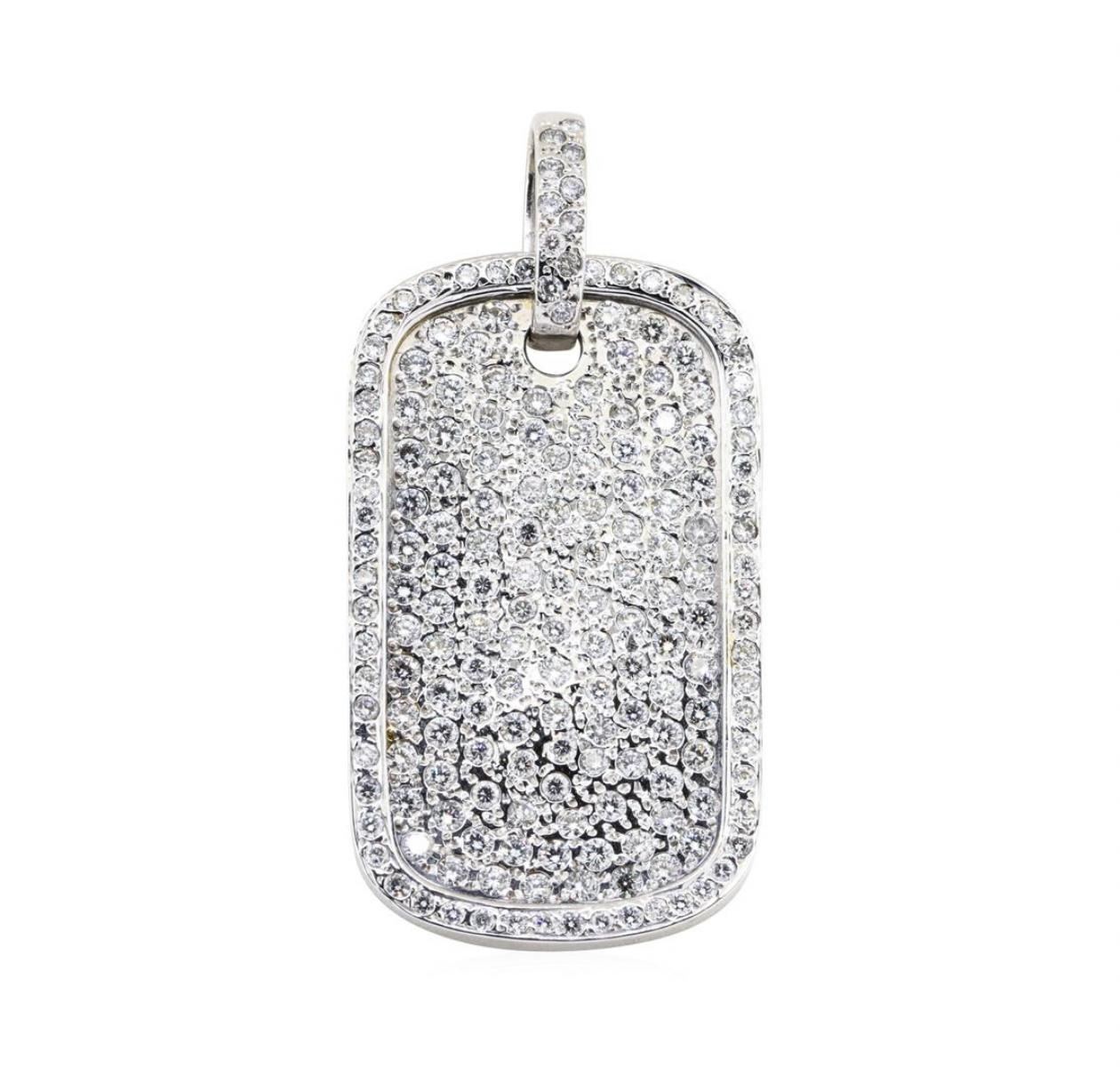 One electronically tested 14KT white gold lady's combination cast & assembled fashion dog tag pendant with a bright polish finish. Identified with markings of '14K'. Condition is Good. Containing: One Hundred Fifteen bead set round brilliant cut diamonds, measuring 2.10 - 2.00 x 1.27mm (depth est.) approximate total weight of 115 Stones = 3.75ct. Graded in the setting. Color H - I Clarity SI-1 to SI-2 Cut Very Good Seventy-One bead set round brilliant cut diamonds, measuring 1.75 - 1.70 x 1.07mm (depth est.) approximate total weight of 71 Stones = 1.40ct. Graded in the setting. Color H - I Clarity SI-1 to SI-2 Cut Very Good. Total Weight of Diamonds 5.15ct.. Total Weight of Pendant 27.80gm GAS Appraised at $11335.00. GAS Appraised.