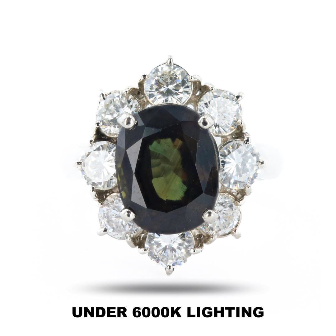 One polished, stamped, and tested platinum ring with a bright finish. The ring is mounted with: | genuine GIA certified alexandrite center stone weighing approximately 5.17 carats, and 8 genuine round diamonds weighing approximately 2.09 carats. This item weighs 10.3 grams, condition is new, excellent workmanship. #MAIN GEMSTONE# GIA Report No.: 2235304901 Species: Natural Chrysoberyl Variety: Natural Alexandrite Shape: Oval Cutting Style: Brilliant Cut Crown, Step Cut Pavilion Measurements: 11.41 x 9.00 x 5.48mm Weight: 5.17 carats Color: Gray-Green Color Change: Purple-Red Transparency: Transparent Refractive Index: 1.746 to 1.755 DR Hardness: 8.5 #ADJACENT GEMSTONES ON RING# Identity: Natural Diamond Shape: Round Cutting Style: Brilliant Cut Quantity: 8 Diamonds Measurements: 4.0 - 4.2mm Total Weight: 2.09 carats Clarity Grade: SI1-SI2 Color Grade: G-H Refractive Index: 2.417 Hardness: 10 ALEXANDRITE WEIGHT: 5.17 ct TOTAL DIAMOND WEIGHT: 2.09 cts WEIGHT OF ITEM: 10.3 grams METAL: Platinum Size: 6