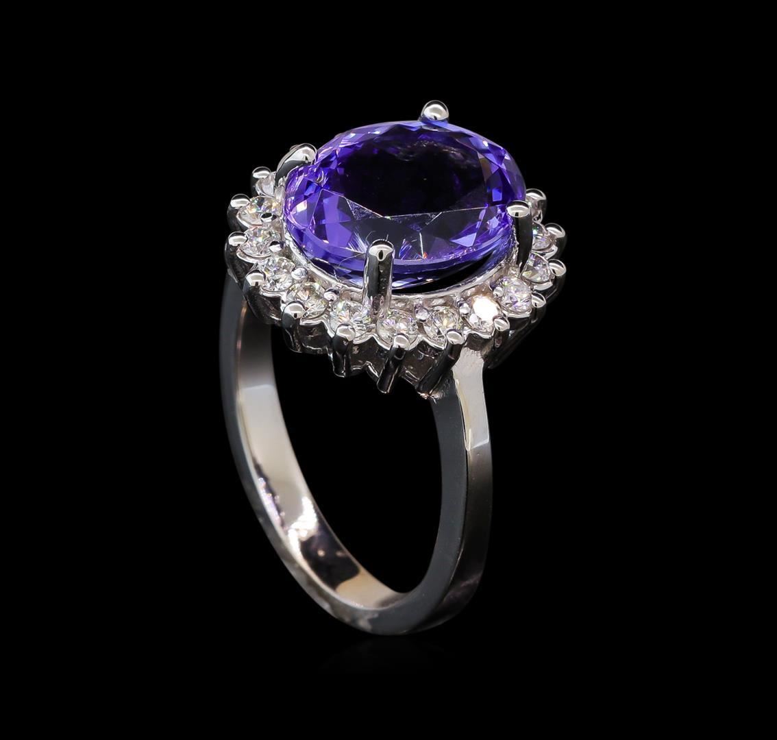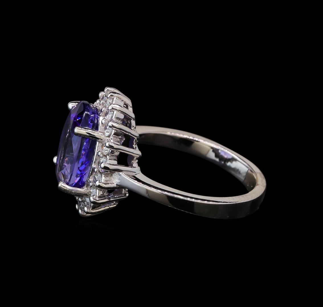 One electronically tested 14KT white gold lady's cast fashion ring with a basket halo with a bright polish finish. The featured lady's ring has a shank measuring 2.69 millimeters wide. Identified with markings of '14K'. Condition is new, good workmanship. Containing: One prong set oval modified brilliant cut natural tanzanite, measuring 11.63 x 9.51 x 6.30mm, (depth est.) 5%. bulge factor, approximate weight of 5.18ct., clarity is eye clean, medium, very slightly grayish, violet color, (GIA V 5/3), cut is good. Transmitting light with no distortion, transparent. Colored gemstones are presumed to have been subjected to commonly used enhancement processes. Graded in the setting. Eighteen prong set round brilliant cut diamonds, measuring 2.00 - 1.90 x 1.21mm (depth est.) approximate total weight of 18 Stones = 0.51ct. Graded in the setting. Clarity SI-1 to I-1. Color: G - I Cut Good. Total Weight of Colored Stones 5.18ct. Total Weight of Diamonds 0.51ct. Total Weight of Ring 6.10gm.