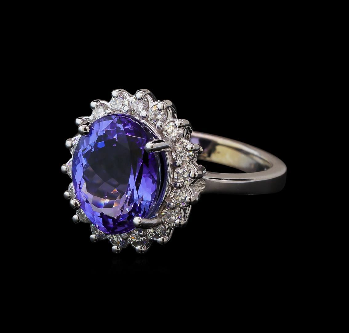 One electronically tested 14KT white gold lady's cast fashion ring with a basket halo with a bright polish finish. The featured lady's ring has a shank measuring 2.69 millimeters wide. Identified with markings of '14K'. Condition is new, good workmanship. Containing: One prong set oval modified brilliant cut natural tanzanite, measuring 11.63 x 9.51 x 6.30mm, (depth est.) 5%. bulge factor, approximate weight of 5.18ct., clarity is eye clean, medium, very slightly grayish, violet color, (GIA V 5/3), cut is good. Transmitting light with no distortion, transparent. Colored gemstones are presumed to have been subjected to commonly used enhancement processes. Graded in the setting. Eighteen prong set round brilliant cut diamonds, measuring 2.00 - 1.90 x 1.21mm (depth est.) approximate total weight of 18 Stones = 0.51ct. Graded in the setting. Clarity SI-1 to I-1. Color: G - I Cut Good. Total Weight of Colored Stones 5.18ct. Total Weight of Diamonds 0.51ct. Total Weight of Ring 6.10gm.