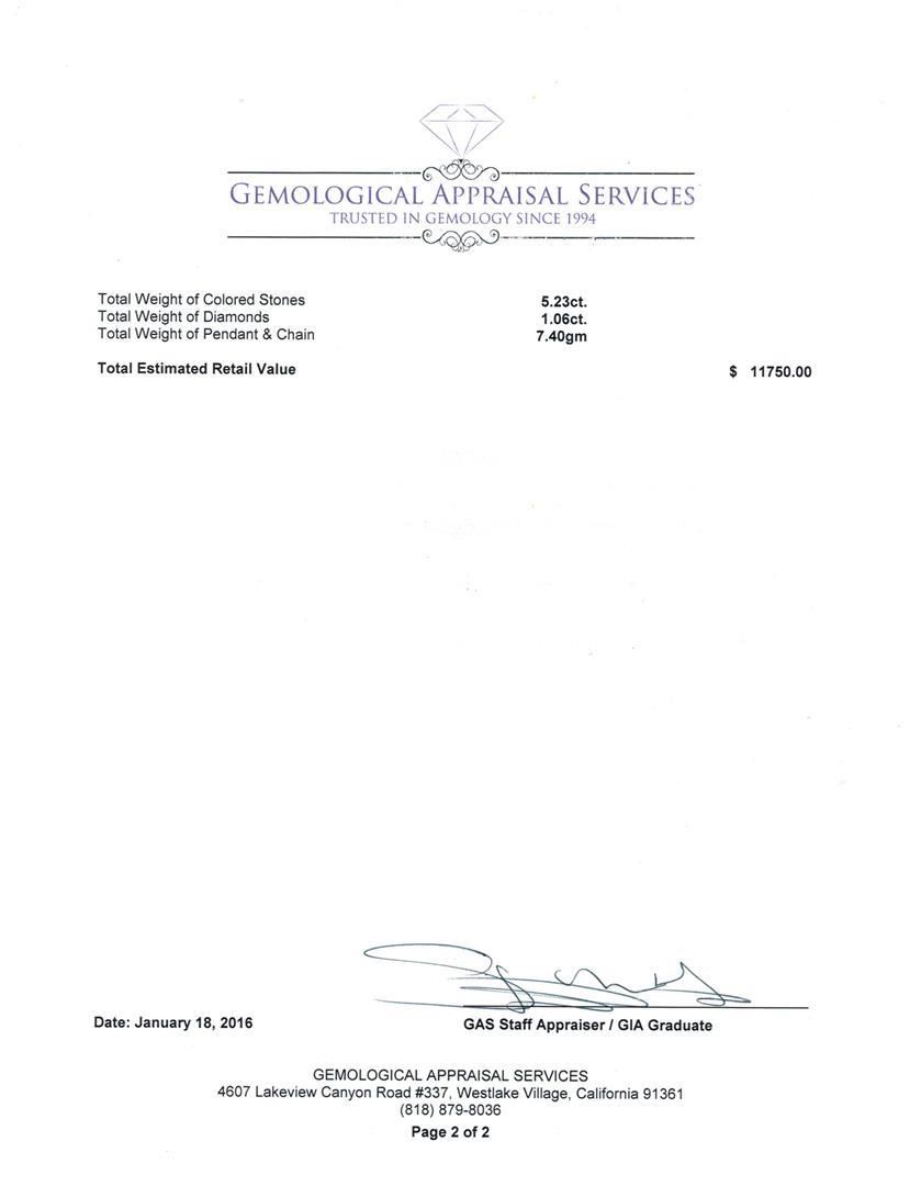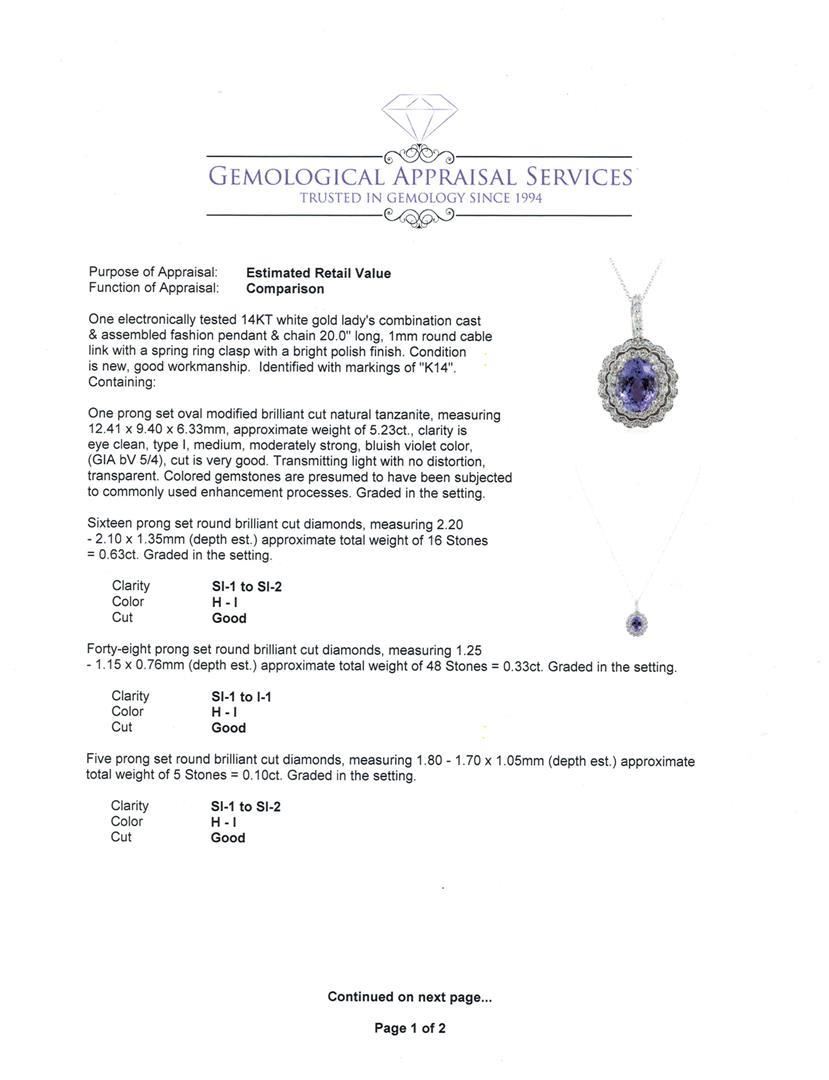 One electronically tested 14KT white gold lady's combination cast & assembled fashion pendant & chain 20.0" long, 1mm round cable link with a spring ring clasp with a bright polish finish. Identified with markings of "K14". Condition is new, good workmanship. Containing: One prong set oval modified brilliant cut natural tanzanite, measuring 12.41 x 9.40 x 6.33mm, approximate weight of 5.23ct., clarity is eye clean, type I, medium, moderately strong, bluish violet color, (GIA bV 5/4), cut is very good. Transmitting light with no distortion, transparent. Colored gemstones are presumed to have been subjected to commonly used enhancement processes. Graded in the setting. Sixteen prong set round brilliant cut diamonds, measuring 2.20 - 2.10 x 1.35mm (depth est.) approximate total weight of 16 Stones = 0.63ct. Graded in the setting. Clarity: SI-1 to SI-2. Color: H - I. Cut Good Forty-Eight prong set round brilliant cut diamonds, measuring 1.25 - 1.15 x 0.76mm (depth est.) approximate total weight of 48 Stones = 0.33ct. Graded in the setting. Clarity: SI-1 to I-1. Color: H - I. Cut Good Five prong set round brilliant cut diamonds, measuring 1.80 - 1.70 x 1.05mm (depth est.) approximate total weight of 5 Stones = 0.10ct. Graded in the setting. Clarity: SI-1 to SI-2. Color: H - I. Cut Good. Total Weight of Colored Stones 5.23ct. Total Weight of Diamonds 1.06ct. Total Weight of Pendant & Chain 7.40gm. GAS Appraised.