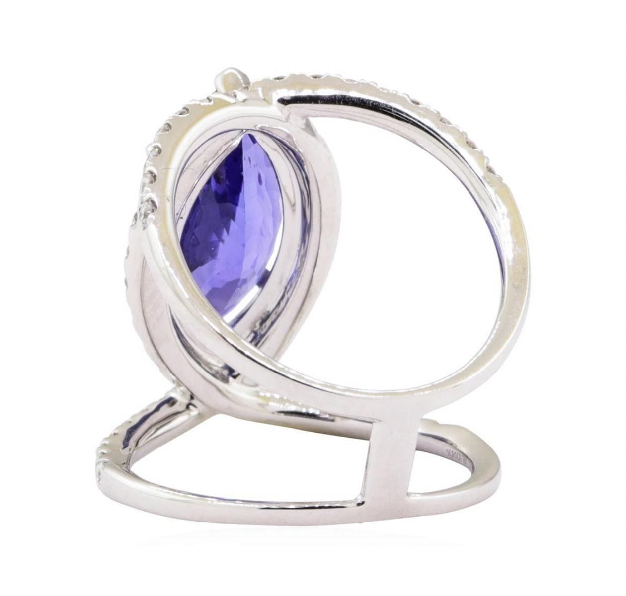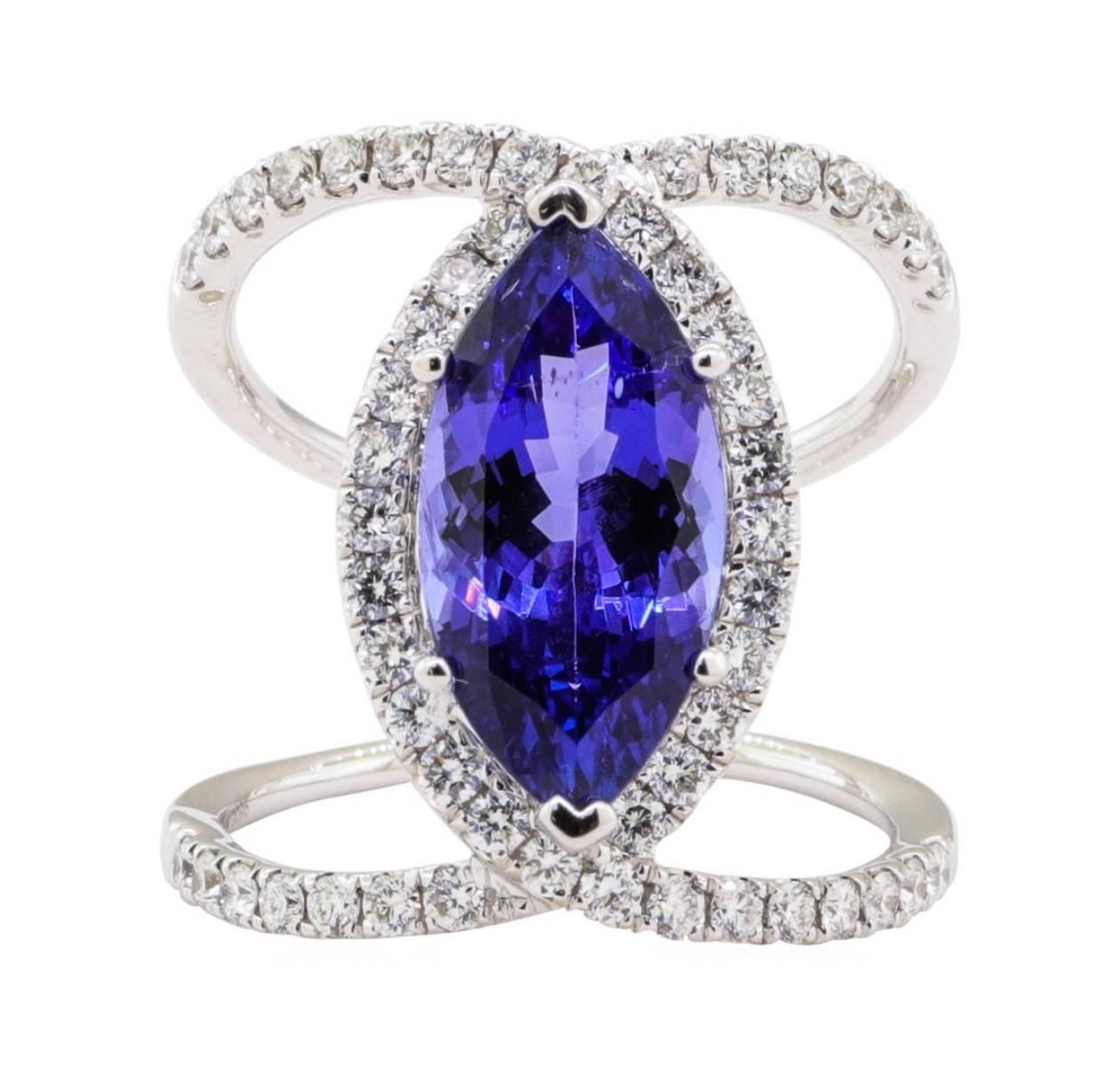 One electronically tested 18KT white gold ladies cast & assembled tanzanite & diamond ring. The featured tanzanite is set within a diamond bezel, supported by diamond ribbon shoulders that attach in the back to create an eight millimeter wide band. Bright polish finish. Trademark is HANA. Identified with markings of "18K". Condition is new, good workmanship. Containing: One prong set marquise mixed cut natural tanzanite, measuring 16.00 x 7.90 x 6.20mm, approximate weight of 5.24ct., clarity is slightly included, type I, medium dark, strong, violetish blue color, (GIA vB 6/5), cut is good. Transmitting light with a minimum of distortion, transparent. Naturally occurring internal & external characteristics are present. Graded in the setting. Tanzanite is a very rare gemstone that is only found in the country of Tanzania. Originally discovered in 1967. Tiffany & Company, named the stone Tanzanite. It is found in the Usumburu Mountains that border the Umba Valley of northern Tanzania. Tanzanite occurs in gray, brown, violet, blue, reddish-purple, & green. The gem is interesting because of its exceptional pleochroism. Rotated in different directions a tanzanite will exhibit multiple changes of color. Tanzanite has a low tolerance to ultrasonic cleaning, and should not be cleaned using this method. Forty prong set round brilliant cut diamonds approximate total weight of 40 Stones = 0.95ct. The clarity & color grade reflect the overall average for the group. Graded in the setting. Clarity SI-1 to I-1 Color F - H Total Weight of Colored Stones 5.24 ct. Total Weight of Diamonds 0.95 ct. Total Weight of Ring 6.80 gm Estimated Retail Value $ 17,270.00 US