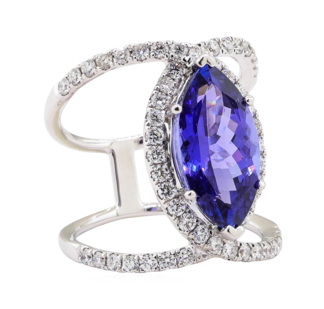 One electronically tested 18KT white gold ladies cast & assembled tanzanite & diamond ring. The featured tanzanite is set within a diamond bezel, supported by diamond ribbon shoulders that attach in the back to create an eight millimeter wide band. Bright polish finish. Trademark is HANA. Identified with markings of "18K". Condition is new, good workmanship. Containing: One prong set marquise mixed cut natural tanzanite, measuring 16.00 x 7.90 x 6.20mm, approximate weight of 5.24ct., clarity is slightly included, type I, medium dark, strong, violetish blue color, (GIA vB 6/5), cut is good. Transmitting light with a minimum of distortion, transparent. Naturally occurring internal & external characteristics are present. Graded in the setting. Tanzanite is a very rare gemstone that is only found in the country of Tanzania. Originally discovered in 1967. Tiffany & Company, named the stone Tanzanite. It is found in the Usumburu Mountains that border the Umba Valley of northern Tanzania. Tanzanite occurs in gray, brown, violet, blue, reddish-purple, & green. The gem is interesting because of its exceptional pleochroism. Rotated in different directions a tanzanite will exhibit multiple changes of color. Tanzanite has a low tolerance to ultrasonic cleaning, and should not be cleaned using this method. Forty prong set round brilliant cut diamonds approximate total weight of 40 Stones = 0.95ct. The clarity & color grade reflect the overall average for the group. Graded in the setting. Clarity SI-1 to I-1 Color F - H Total Weight of Colored Stones 5.24 ct. Total Weight of Diamonds 0.95 ct. Total Weight of Ring 6.80 gm Estimated Retail Value $ 17,270.00 US