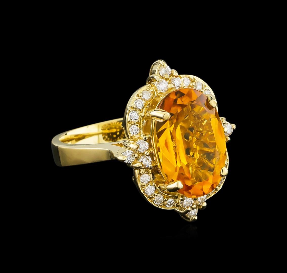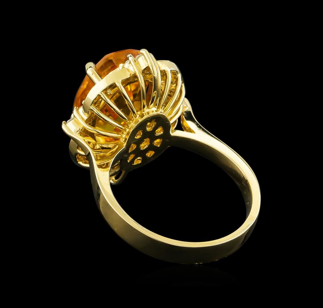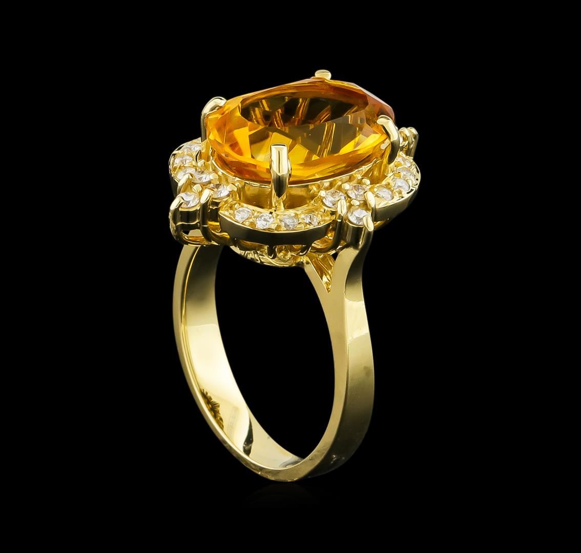 One Ring featuring: 14KT Yellow Gold weighing 7 grams containing one Citrine center stone with a total weight of 5.25ct and Diamonds with a total weight of 0.36ct.