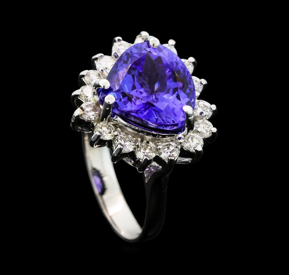 One electronically tested 14KT white gold lady's cast fashion ring with a basket halo with a bright polish finish. The featured lady's ring has a shank measuring 2.91 millimeters wide. Identified with markings of 'K14'. Condition is new, good workmanship. Containing: One prong set pear modified brilliant cut natural tanzanite, measuring 10.91 x 11.11 x 6.84mm, (depth est.) approximate weight of 5.25ct., clarity is eye clean, medium dark, moderately strong, violetish blue color, (GIA vB 6/4), cut is very good. Transmitting light with no distortion, transparent. Colored gemstones are presumed to have been subjected to commonly used enhancement processes. Graded in the setting. Sixteen prong set round brilliant cut diamonds, measuring 2.40 - 2.30 x 1.46mm (depth est.) approximate total weight of 16 Stones = 0.80ct. Graded in the setting. Color H - I Clarity SI-1 to SI-2 Cut Good. Total Weight of Colored Stones 5.25ct.. Total Weight of Diamonds 0.80ct.. Total Weight of Ring 6.30gm. GAS Appraised.