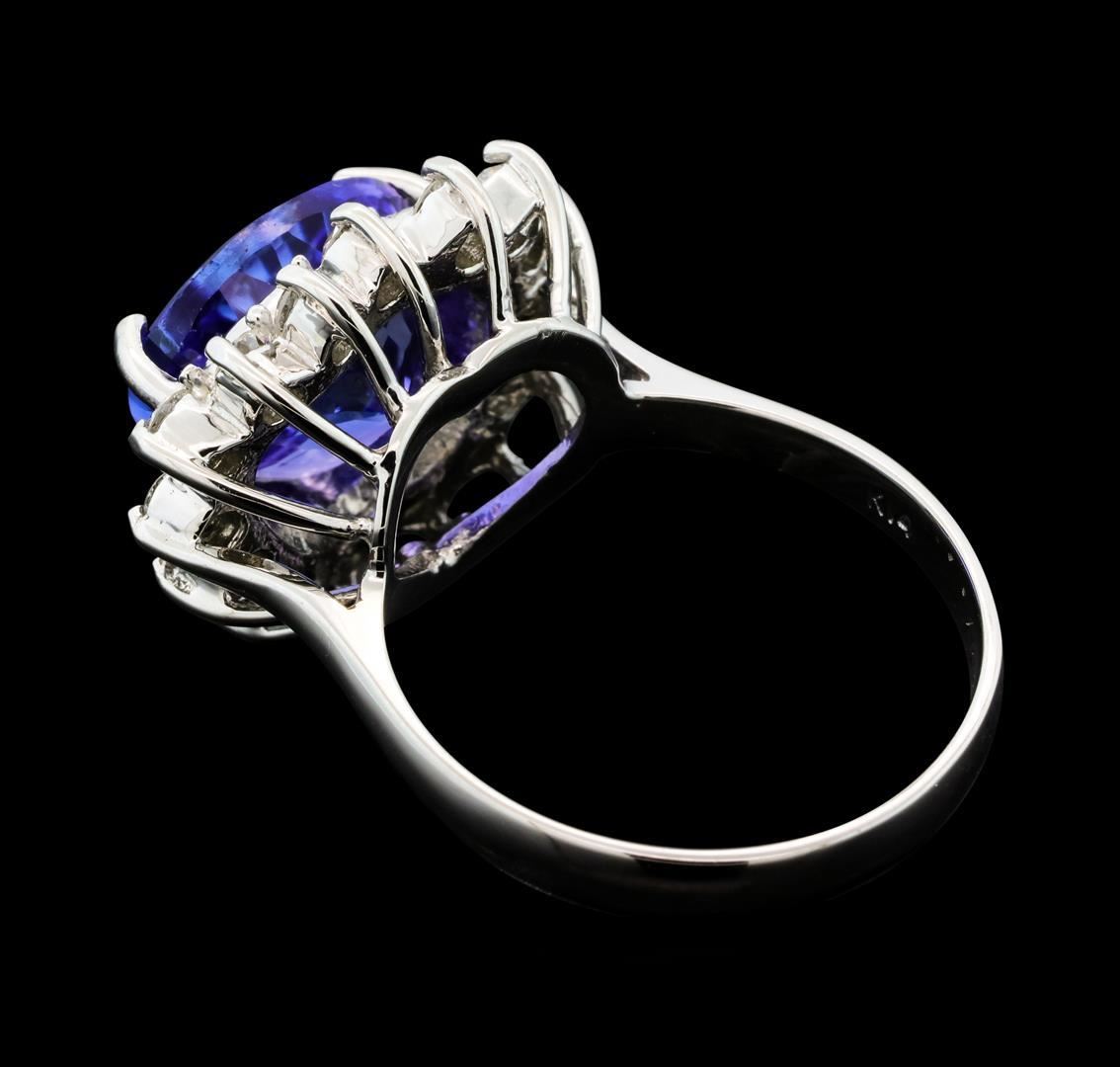 One electronically tested 14KT white gold lady's cast fashion ring with a basket halo with a bright polish finish. The featured lady's ring has a shank measuring 2.91 millimeters wide. Identified with markings of 'K14'. Condition is new, good workmanship. Containing: One prong set pear modified brilliant cut natural tanzanite, measuring 10.91 x 11.11 x 6.84mm, (depth est.) approximate weight of 5.25ct., clarity is eye clean, medium dark, moderately strong, violetish blue color, (GIA vB 6/4), cut is very good. Transmitting light with no distortion, transparent. Colored gemstones are presumed to have been subjected to commonly used enhancement processes. Graded in the setting. Sixteen prong set round brilliant cut diamonds, measuring 2.40 - 2.30 x 1.46mm (depth est.) approximate total weight of 16 Stones = 0.80ct. Graded in the setting. Color H - I Clarity SI-1 to SI-2 Cut Good. Total Weight of Colored Stones 5.25ct.. Total Weight of Diamonds 0.80ct.. Total Weight of Ring 6.30gm. GAS Appraised.