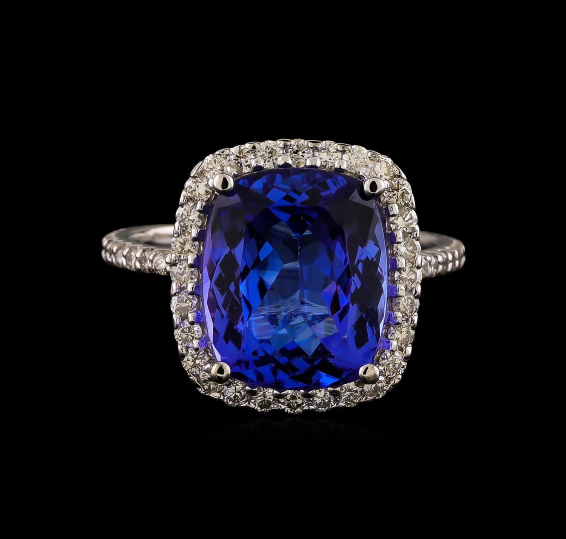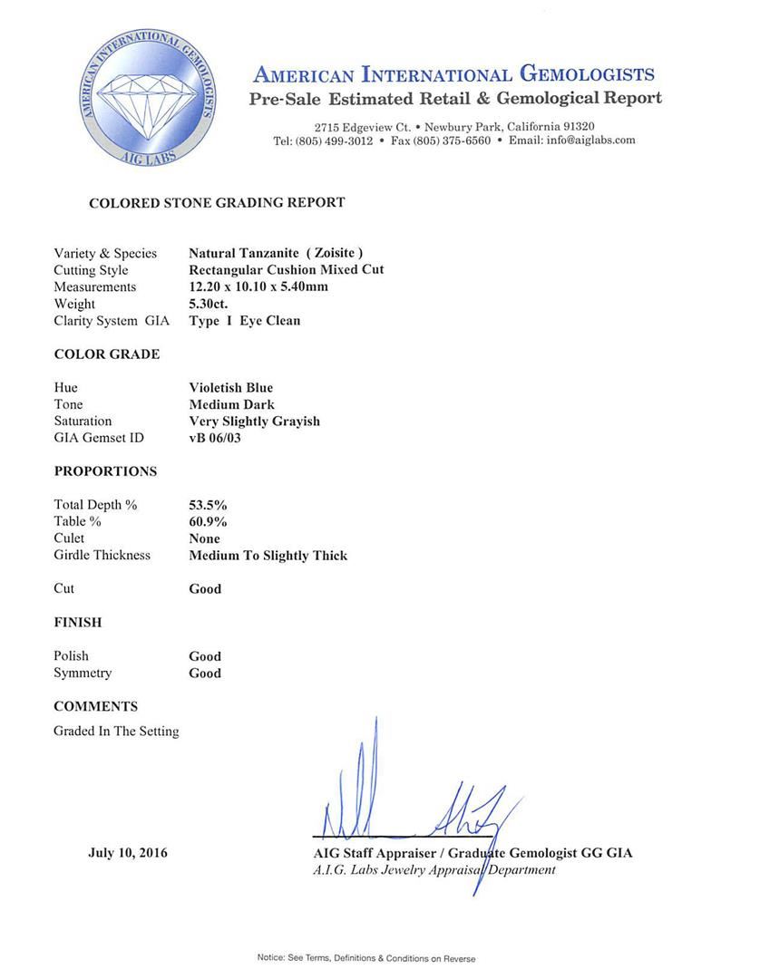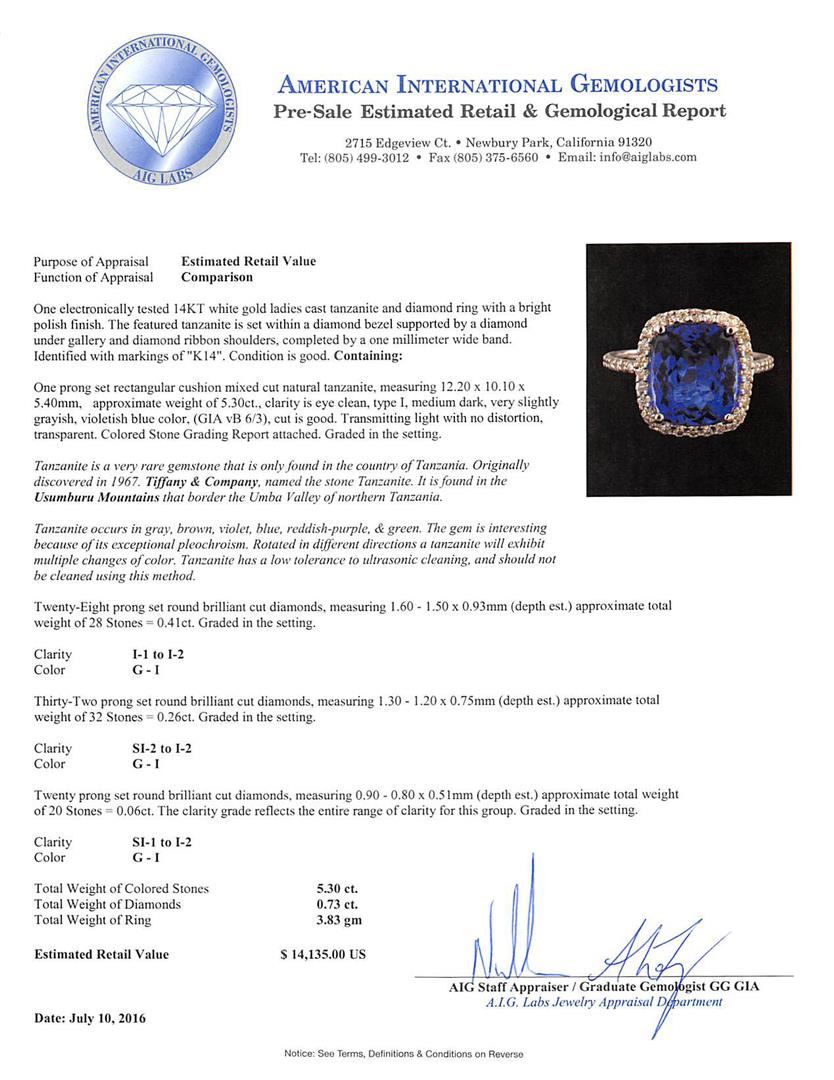 One electronically tested 14KT white gold ladies cast tanzanite and diamond ring with a bright polish finish. The featured tanzanite is set within a diamond bezel supported by a diamond under gallery and diamond ribbon shoulders, completed by a one millimeter wide band. Identified with markings of "K14". Condition is good. Containing: One prong set rectangular cushion mixed cut natural tanzanite, measuring 12.20 x 10.10 x 5.40mm, approximate weight of 5.30ct., clarity is eye clean, type I, medium dark, very slightly grayish, violetish blue color, (GIA vB 6/3), cut is good. Transmitting light with no distortion, transparent. Colored Stone Grading Report attached. Graded in the setting. Tanzanite is a very rare gemstone that is only found in the country of Tanzania. Originally discovered in 1967. Tiffany & Company, named the stone Tanzanite. It is found in the Usumburu Mountains that border the Umba Valley of northern Tanzania. Tanzanite occurs in gray, brown, violet, blue, reddish-purple, & green. The gem is interesting because of its exceptional pleochroism. Rotated in different directions a tanzanite will exhibit multiple changes of color. Tanzanite has a low tolerance to ultrasonic cleaning, and should not be cleaned using this method. Twenty-Eight prong set round brilliant cut diamonds, measuring 1.60 - 1.50 x 0.93mm (depth est.) approximate total weight of 28 Stones = 0.41ct. Graded in the setting. Clarity I-1 to I-2. Color: G - I Thirty-Two prong set round brilliant cut diamonds, measuring 1.30 - 1.20 x 0.75mm (depth est.) approximate total weight of 32 Stones = 0.26ct. Graded in the setting. Clarity SI-2 to I-2. Color: G - I Twenty prong set round brilliant cut diamonds, measuring 0.90 - 0.80 x 0.51mm (depth est.) approximate total weight of 20 Stones = 0.06ct. The clarity grade reflects the entire range of clarity for this group. Graded in the setting. Clarity SI-1 to I-2. Color: G - I. Total Weight of Colored Stones 5.30ct.. Total Weight of Diamonds 0.73ct.. Total Weight of Ring 3.83gm. AIG Appraised at $14,135.00.