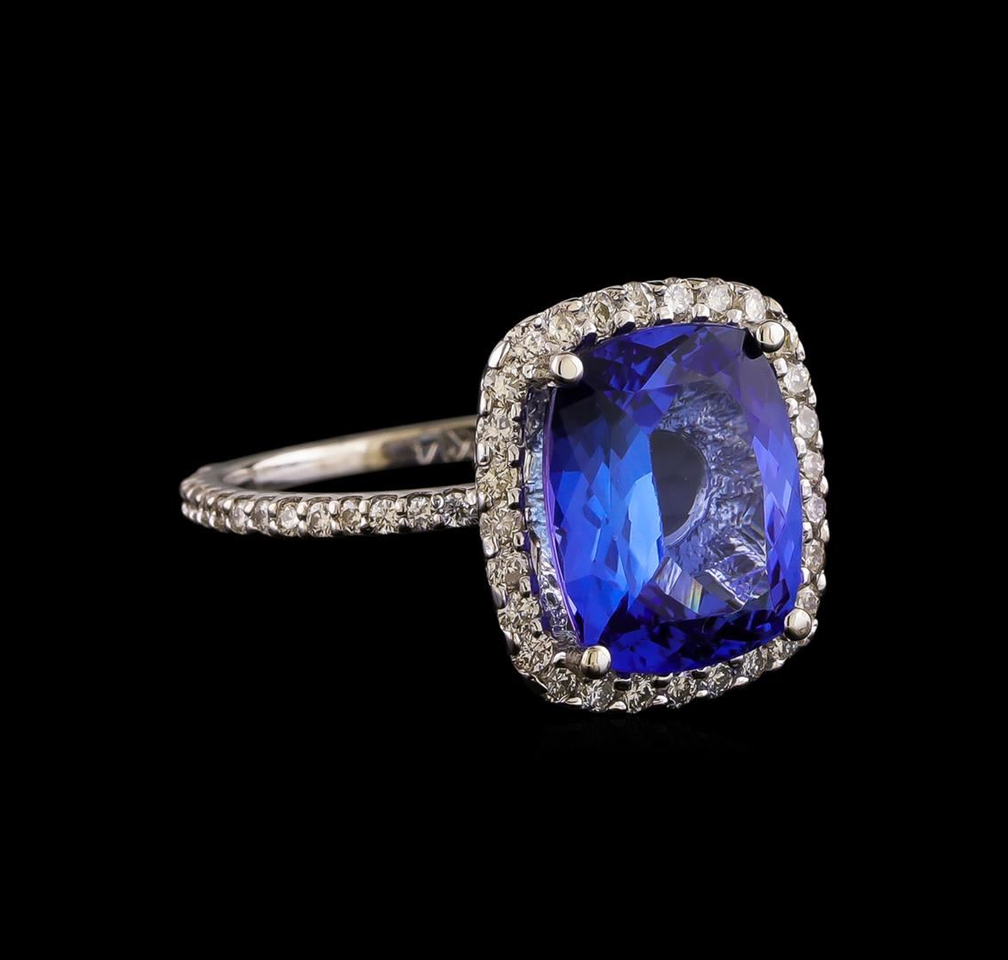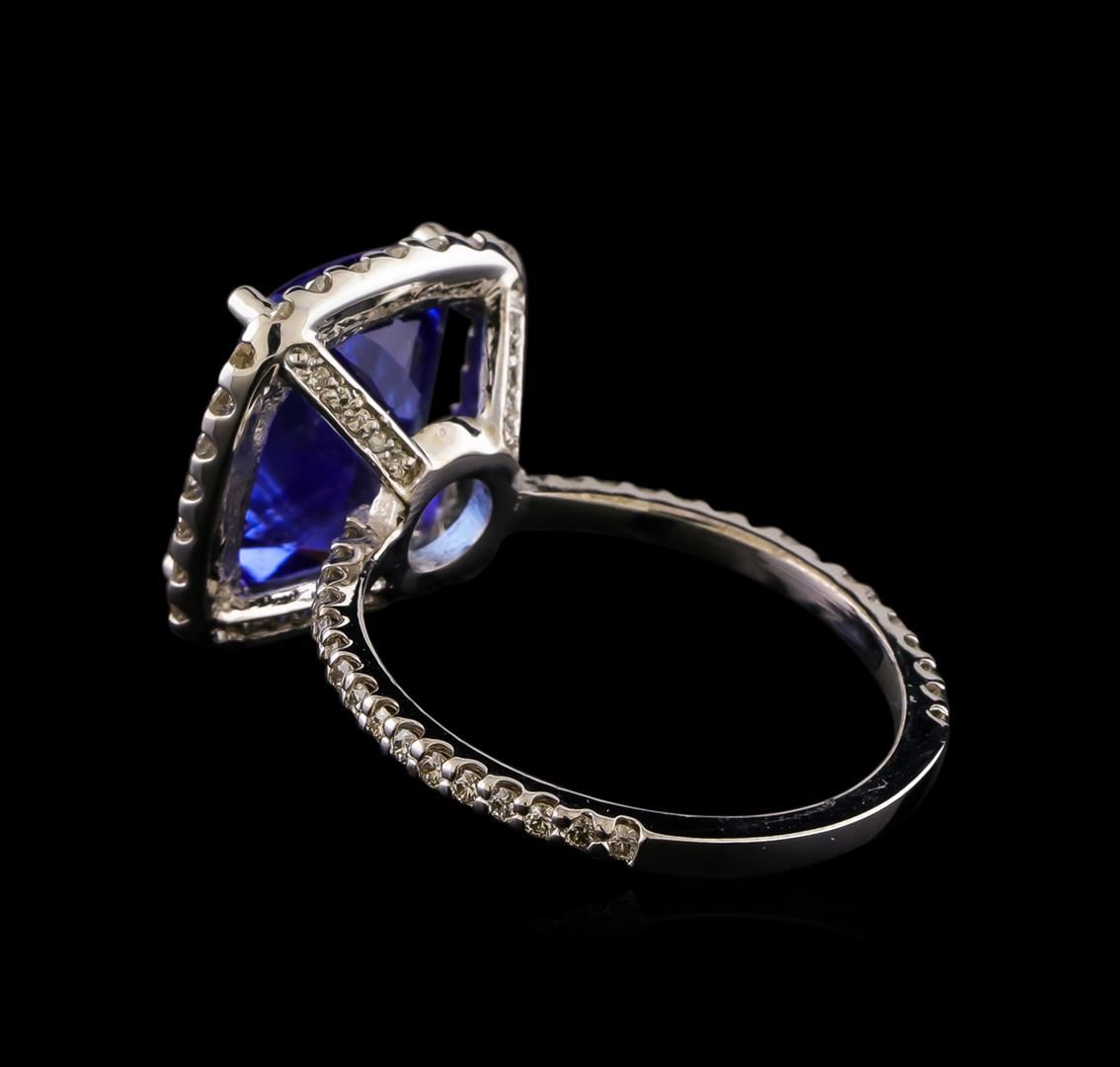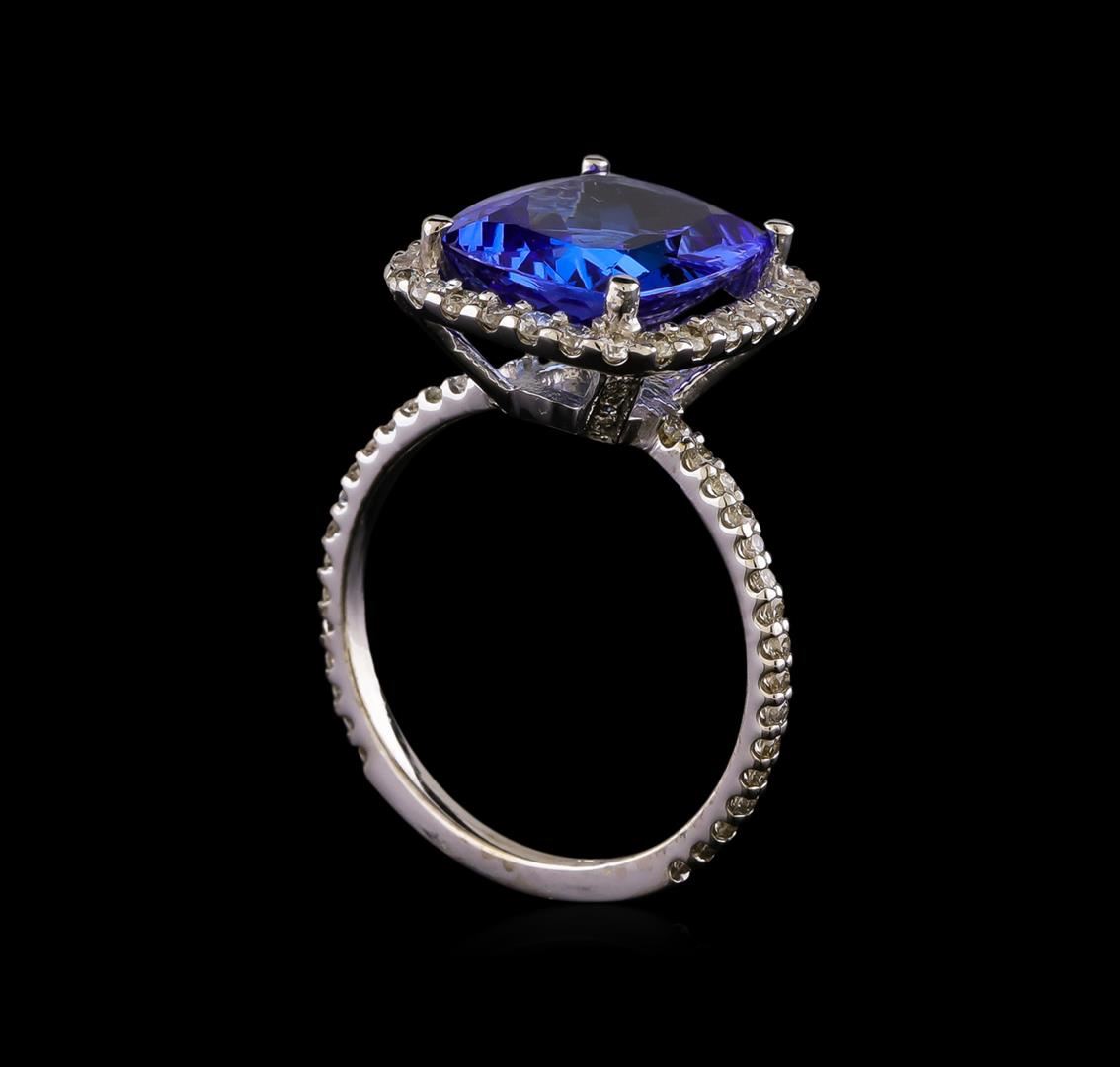One electronically tested 14KT white gold ladies cast tanzanite and diamond ring with a bright polish finish. The featured tanzanite is set within a diamond bezel supported by a diamond under gallery and diamond ribbon shoulders, completed by a one millimeter wide band. Identified with markings of "K14". Condition is good. Containing: One prong set rectangular cushion mixed cut natural tanzanite, measuring 12.20 x 10.10 x 5.40mm, approximate weight of 5.30ct., clarity is eye clean, type I, medium dark, very slightly grayish, violetish blue color, (GIA vB 6/3), cut is good. Transmitting light with no distortion, transparent. Colored Stone Grading Report attached. Graded in the setting. Tanzanite is a very rare gemstone that is only found in the country of Tanzania. Originally discovered in 1967. Tiffany & Company, named the stone Tanzanite. It is found in the Usumburu Mountains that border the Umba Valley of northern Tanzania. Tanzanite occurs in gray, brown, violet, blue, reddish-purple, & green. The gem is interesting because of its exceptional pleochroism. Rotated in different directions a tanzanite will exhibit multiple changes of color. Tanzanite has a low tolerance to ultrasonic cleaning, and should not be cleaned using this method. Twenty-Eight prong set round brilliant cut diamonds, measuring 1.60 - 1.50 x 0.93mm (depth est.) approximate total weight of 28 Stones = 0.41ct. Graded in the setting. Clarity I-1 to I-2. Color: G - I Thirty-Two prong set round brilliant cut diamonds, measuring 1.30 - 1.20 x 0.75mm (depth est.) approximate total weight of 32 Stones = 0.26ct. Graded in the setting. Clarity SI-2 to I-2. Color: G - I Twenty prong set round brilliant cut diamonds, measuring 0.90 - 0.80 x 0.51mm (depth est.) approximate total weight of 20 Stones = 0.06ct. The clarity grade reflects the entire range of clarity for this group. Graded in the setting. Clarity SI-1 to I-2. Color: G - I. Total Weight of Colored Stones 5.30ct.. Total Weight of Diamonds 0.73ct.. Total Weight of Ring 3.83gm. AIG Appraised at $14,135.00.