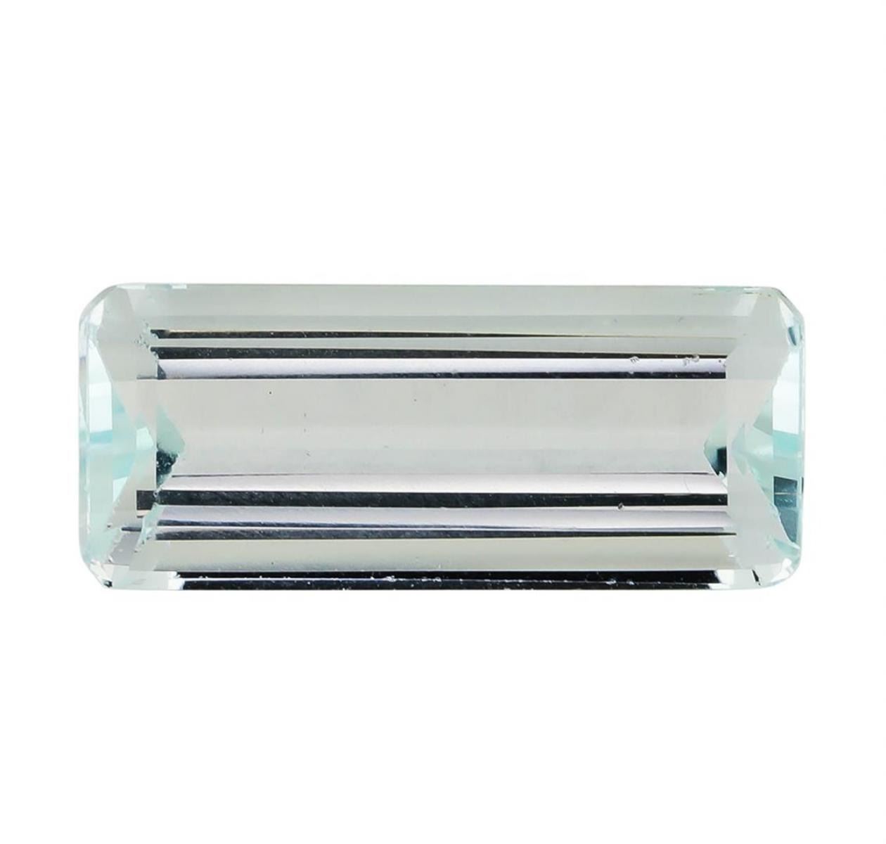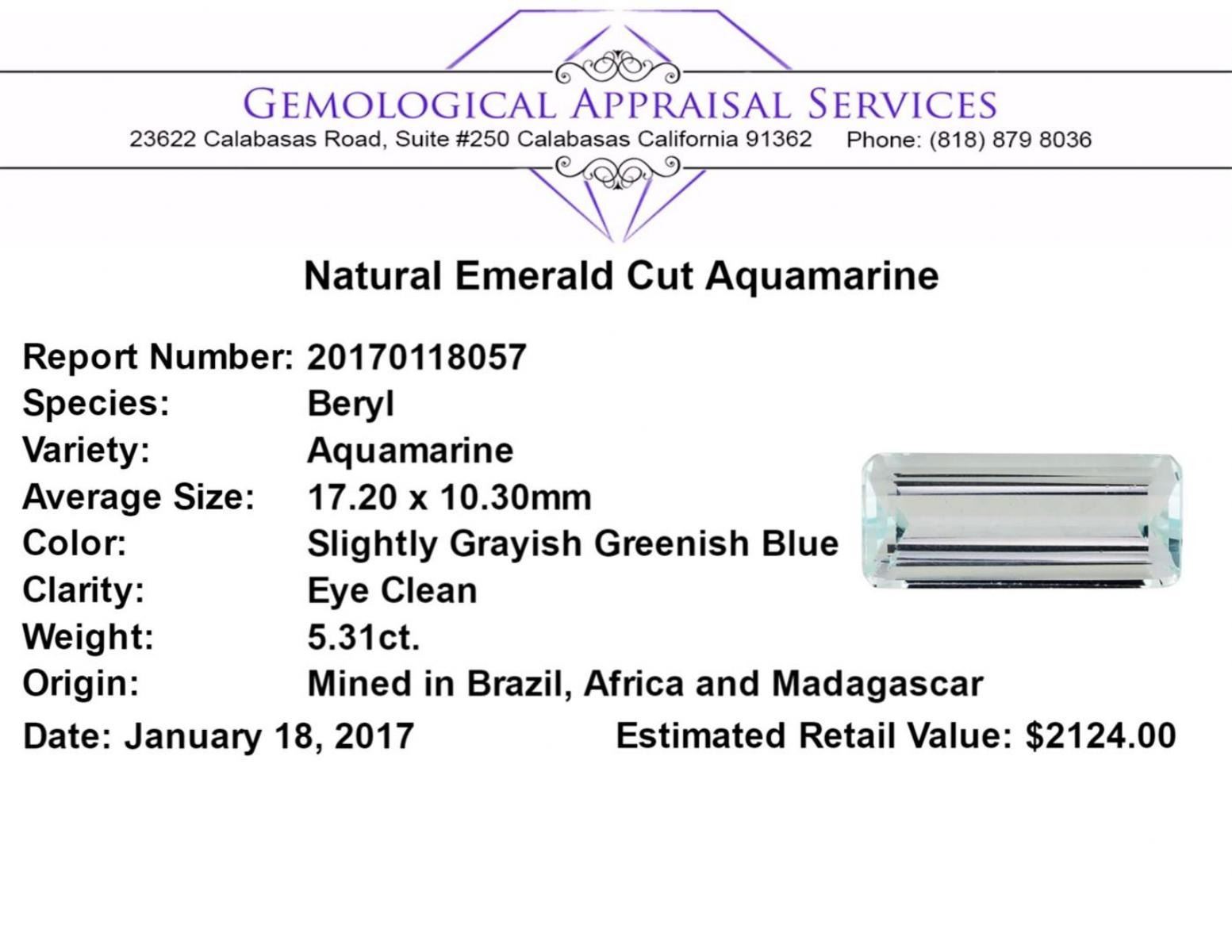 One natural emerald cut aquamarine with an exact weight of 5.31ct., clarity is eye clean, slightly grayish greenish blue. Gemological Appraisals Services estimates the retail value at $2124 GAS Appraised.