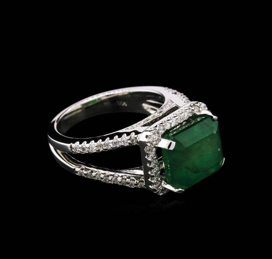 One electronically tested 14KT white gold lady's cast fashion ring with a split shank with a bright polish finish. The featured lady's ring has a shank measuring 3.40 millimeters in width. Identified with markings of "14K". Condition is new, good workmanship. Containing: One prong set emerald step cut natural emerald, measuring 10.73 x 9.29 x 6.61mm, 10% bulge factor, approximate weight of 5.35ct., clarity is heavily included, type III, medium dark, moderately strong, green color, (GIA G 6/4), cut is good. Transmitting light somewhat diffusely, semi-transparent to translucent. Indications of oil residue. Naturally occurring internal & external characteristics are present. Graded in the setting. Seventy-Four shared prong set round brilliant cut diamonds, measuring 1.40 - 1.30 x 0.81mm (depth est.) approximate total weight of 74 Stones = 0.67ct. Graded in the setting. Clarity: I-1 to I-2. Color: H - Good. Total Weight of Colored Stones 5.35ct. Total Weight of Diamonds 0.67ct. Total Weight of Ring 8.20gm. GAS Appraised.