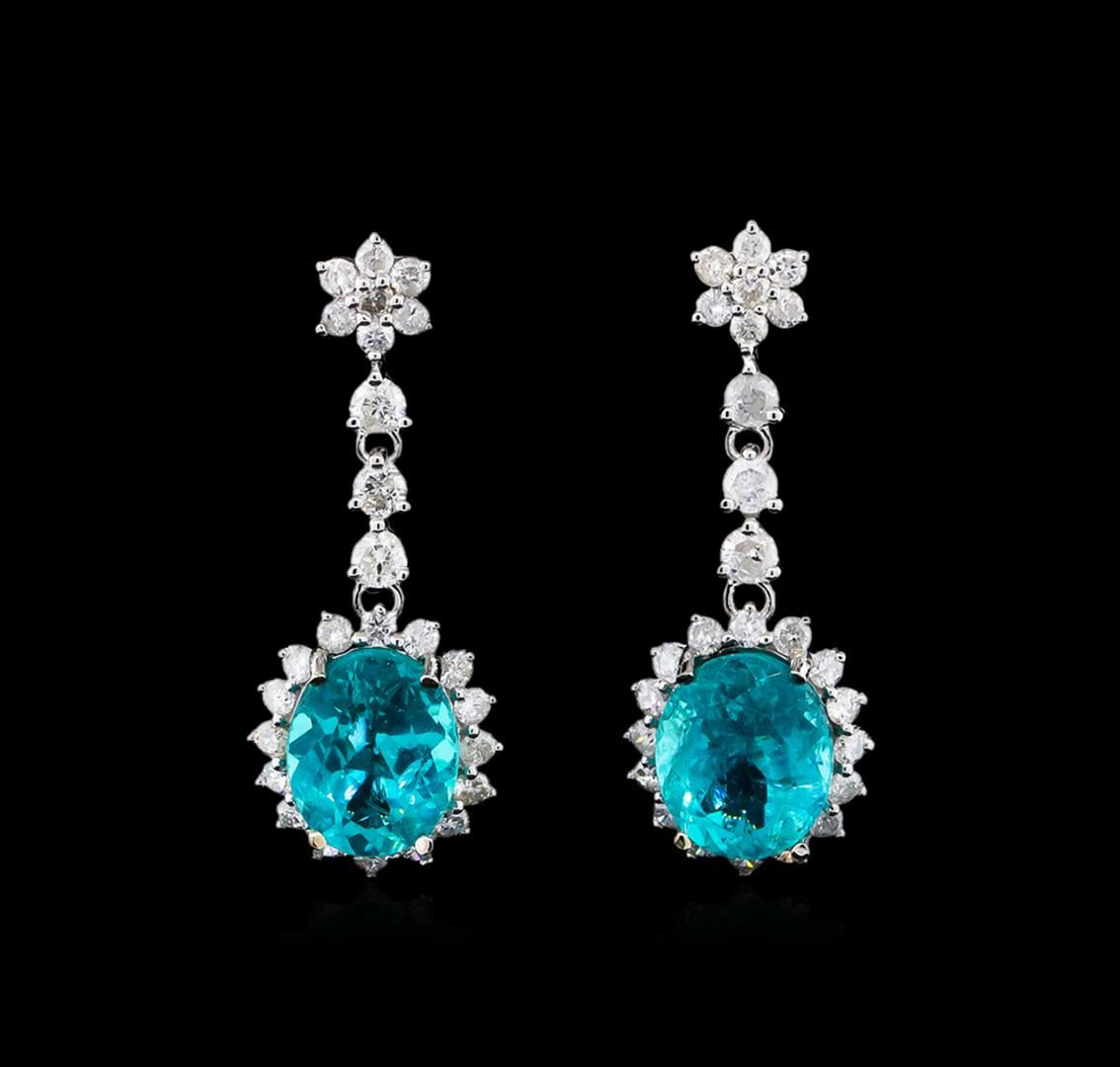 One pair electronically tested 14KT white gold lady's combination cast & assembled dangle halo earrings with threaded posts and screw-on/screw-off backs with a bright polish finish. The dangle ladies earrings have a drop of 30 millimeters. Trademark is Orianne. Identified with markings of "14K". Condition is new, good workmanship. Containing: Two prong set oval modified brilliant cut natural apatites, measuring 9.88 x 7.86 x 5.27mm, approximate total weight of 5.39ct., clarity is moderately included, medium dark, moderately strong, bluish green color, (GIA bG 6/4), cut is good. Transmitting light somewhat diffusely, semi-transparent to translucent. Colored gemstones are presumed to have been subjected to commonly used enhancement processes. Graded in the setting. Six prong set round brilliant cut diamonds, measuring 2.50 - 2.45 x 1.56mm (depth est.) approximate total weight of 6 Stones = 0.35ct. Graded in the setting. Clarity: I-1 to I-2. Color: G - H. Cut Good Forty-Three prong set round brilliant cut diamonds, measuring 1.90 - 1.80 x 1.17mm (depth est.) approximate total weight of 43 Stones = 1.10ct. Graded in the setting. Clarity: I-1 to I-2. Color: G - Good. Total Weight of Colored Stones 5.39ct. Total Weight of Diamonds 1.45ct. Total Weight of Earrings 4.50gm. GAS Appraised at $6,250.00.