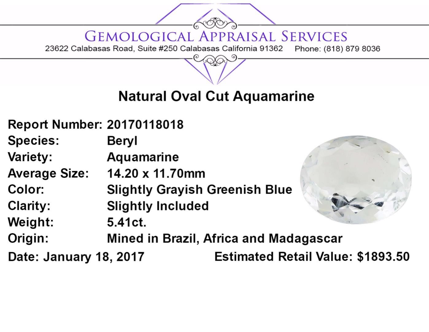 One natural oval cut aquamarine with an exact weight of 5.41ct., clarity is slightly included, slightly grayish greenish blue. Gemological Appraisals Services estimates the retail value at $1893.5 GAS Appraised.