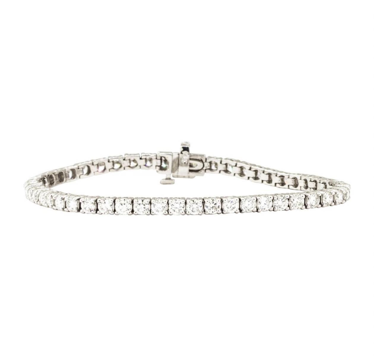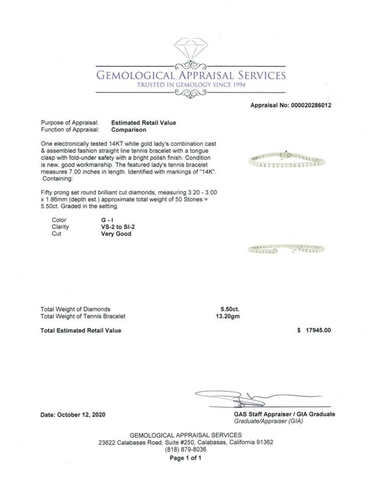 One electronically tested 14KT white gold lady's combination cast & assembled fashion straight line tennis bracelet with a tongue clasp with fold-under safety with a bright polish finish. The featured lady's tennis bracelet measures 7.00 inches in length. Identified with markings of '14K'. Condition is new, good workmanship. Containing: Fifty prong set round brilliant cut diamonds, measuring 3.20 - 3.00 x 1.86mm (depth est.) approximate total weight of 50 Stones = 5.50ct. Graded in the setting. Color G - I Clarity VS-2 to SI-2 Cut Very Good. Total Weight of Diamonds 5.50ct.. Total Weight of Tennis Bracelet 13.20gm GAS Appraised at $17945.00. GAS Appraised.