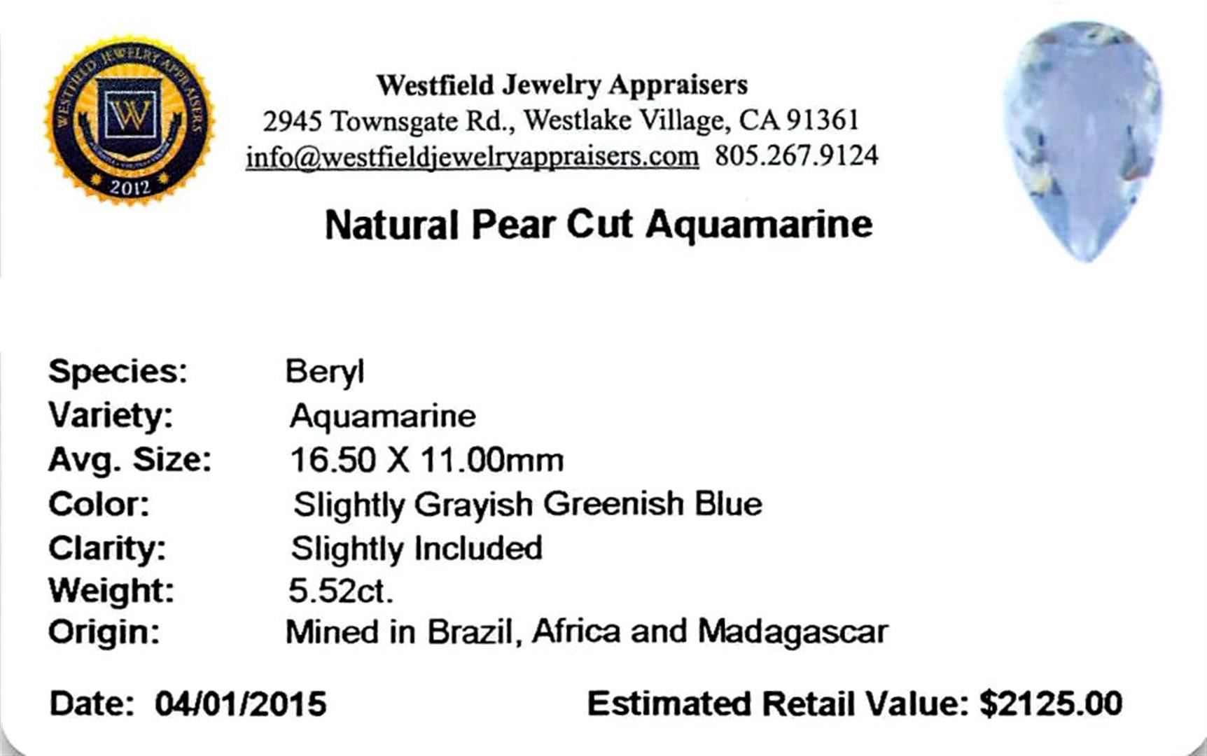 One pear cut natural aquamarine exact weight 5.52ct., clarity is slightly included, type I, medium, slightly grayish, very slightly greenish blue color, (GIA vslgB 5/2), cut is good. Westfield Appraised.