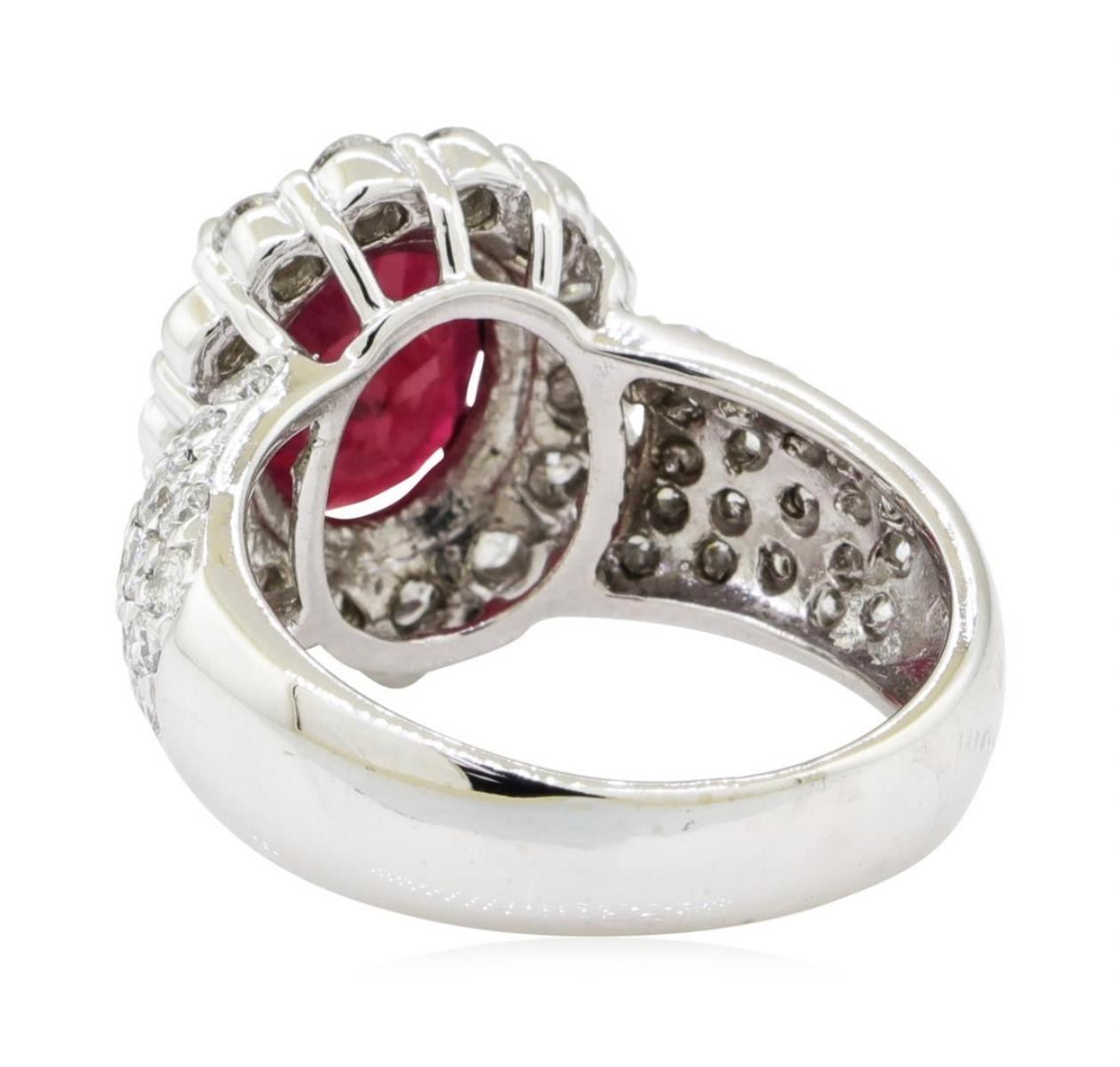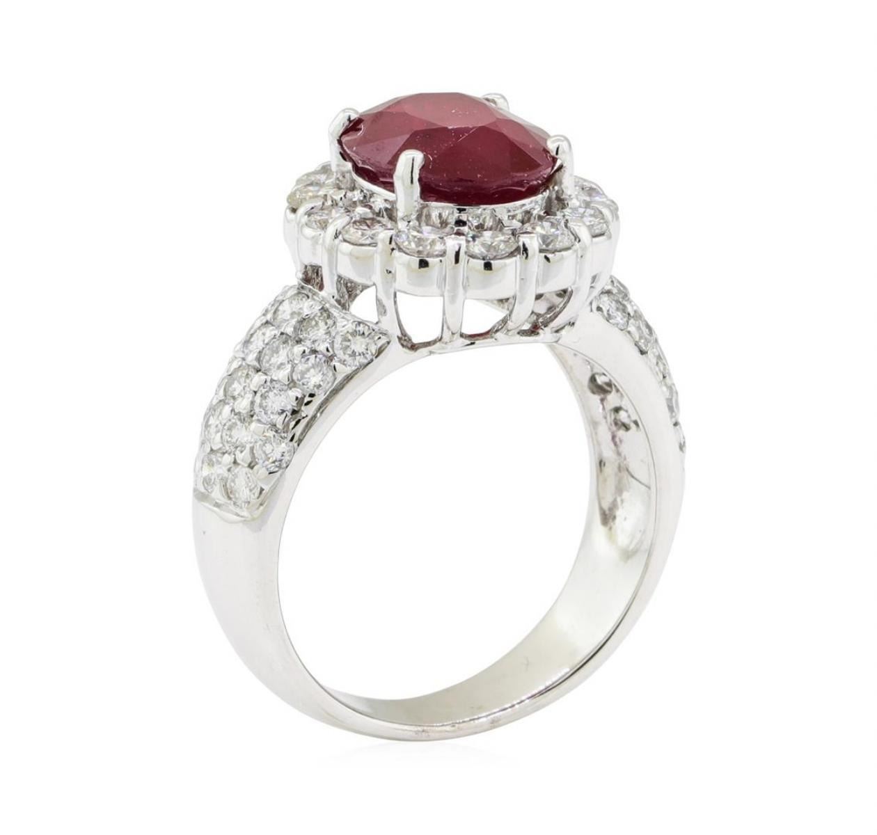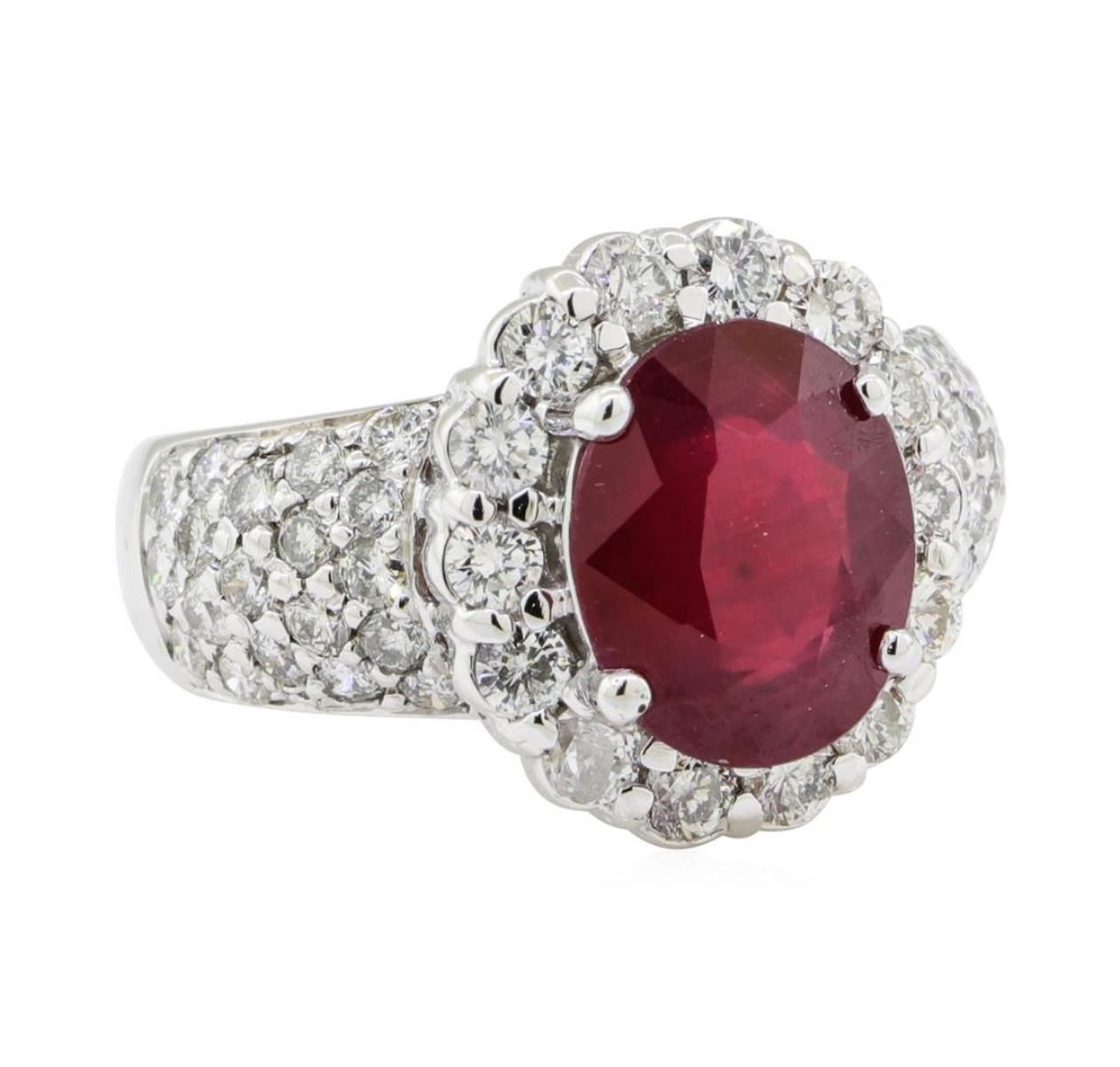 One electronically tested 14KT white gold lady's cast fashion ring with a domed tapered shank with a bright polish finish. The featured lady's ring has a pave set diamond shank measuring 4.30 millimeters wide. Identified with markings of '14K'. Condition is new, good workmanship. Containing: One prong set oval modified mixed cut natural ruby, measuring 10.90 x 8.85 x 4.71mm, (depth est.) approximate weight of 3.82ct., clarity is heavily included, medium dark, very slightly brownish, red color, (GIA R 6/3), cut is very good. Transmitting light somewhat diffusely, semi-transparent to translucent. Naturally occurring internal & external characteristics are present. Indications of laboratory high temperature heat treatment. Colored gemstones are presumed to have been subjected to commonly used enhancement processes. Graded in the setting. Fourteen prong set round brilliant cut diamonds, measuring 2.50 - 2.45 x 1.54mm (depth est.) approximate total weight of 14 Stones = 0.80ct. Graded in the setting. Color G - H Clarity SI-1 to I-1 Cut Good Thirty-Eight bead set round brilliant cut diamonds, measuring 1.85 - 1.85 x 1.15mm (depth est.) approximate total weight of 38 Stones = 0.90ct. Graded in the setting. Color G - H Clarity SI-1 to I-1 Cut Very Good. Total Weight of Colored Stones 3.82ct.. Total Weight of Diamonds 1.70ct.. Total Weight of Ring 8.20gm GAS Appraised at $8200.00. GAS Appraised at $8,200.00.