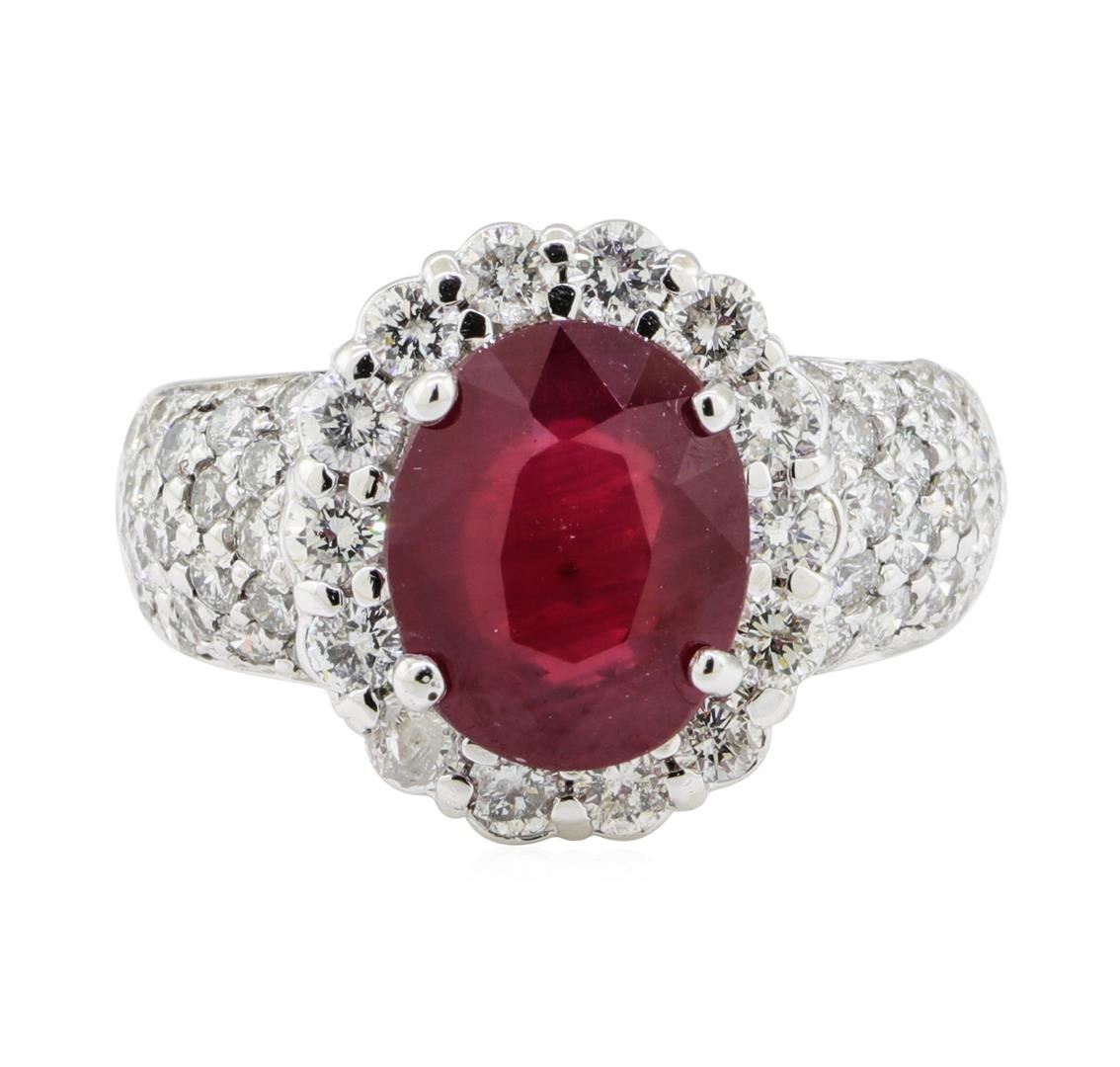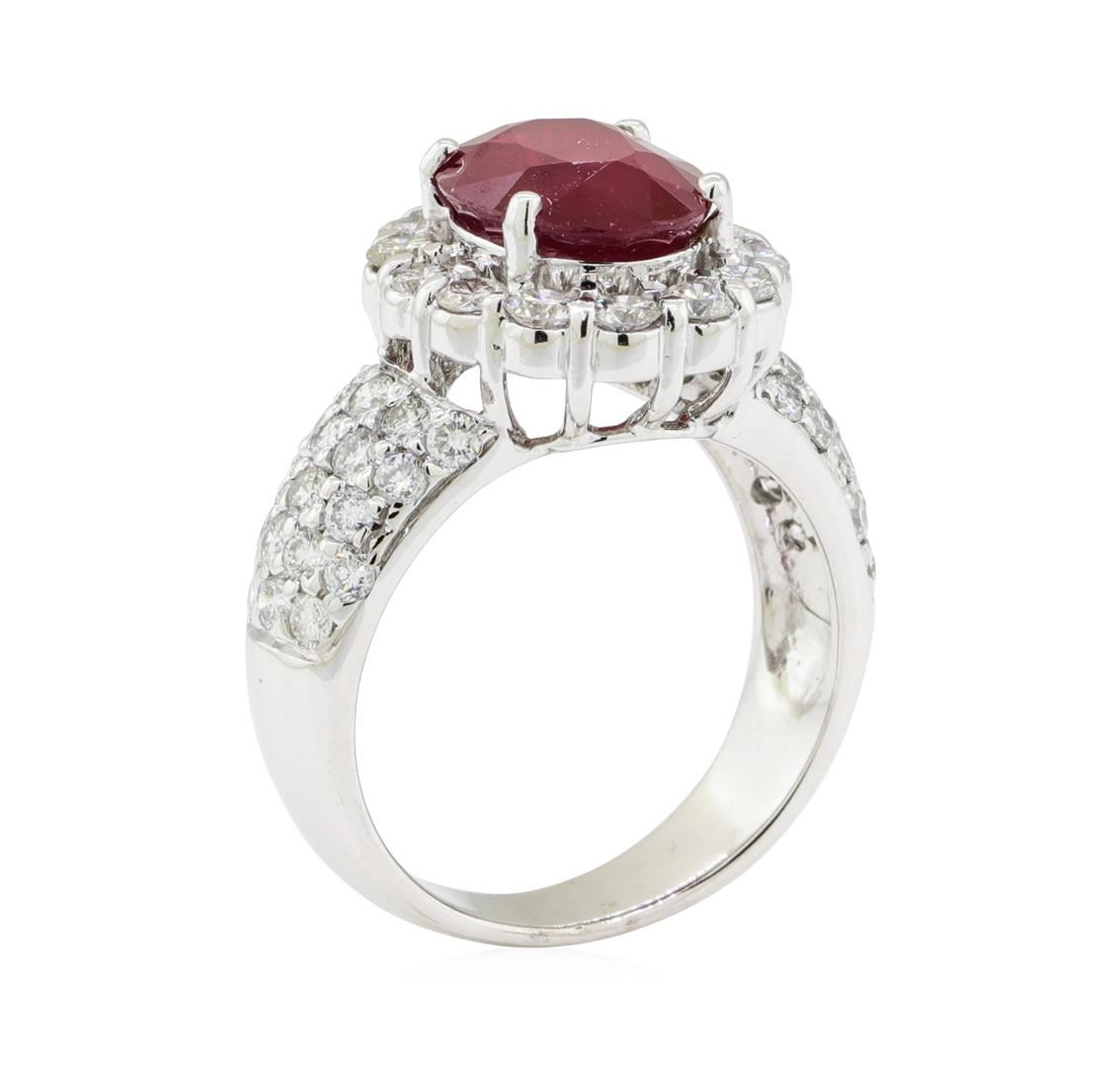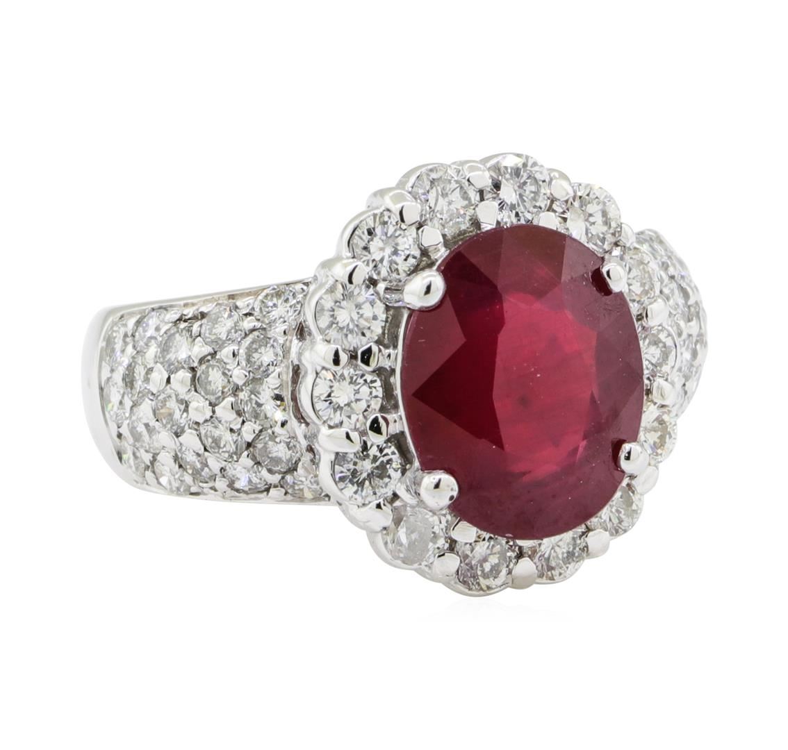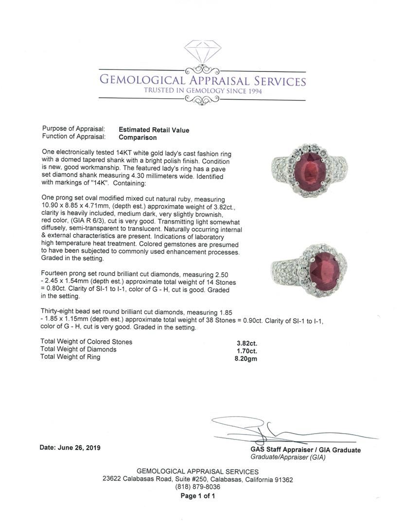 One electronically tested 14KT white gold lady's cast fashion ring with a domed tapered shank with a bright polish finish. The featured lady's ring has a pave set diamond shank measuring 4.30 millimeters wide. Identified with markings of '14K'. Condition is new, good workmanship. Containing: One prong set oval modified mixed cut natural ruby, measuring 10.90 x 8.85 x 4.71mm, (depth est.) approximate weight of 3.82ct., clarity is heavily included, medium dark, very slightly brownish, red color, (GIA R 6/3), cut is very good. Transmitting light somewhat diffusely, semi-transparent to translucent. Naturally occurring internal & external characteristics are present. Indications of laboratory high temperature heat treatment. Colored gemstones are presumed to have been subjected to commonly used enhancement processes. Graded in the setting. Fourteen prong set round brilliant cut diamonds, measuring 2.50 - 2.45 x 1.54mm (depth est.) approximate total weight of 14 Stones = 0.80ct. Graded in the setting. Color G - H Clarity SI-1 to I-1 Cut Good Thirty-Eight bead set round brilliant cut diamonds, measuring 1.85 - 1.85 x 1.15mm (depth est.) approximate total weight of 38 Stones = 0.90ct. Graded in the setting. Color G - H Clarity SI-1 to I-1 Cut Very Good. Total Weight of Colored Stones 3.82ct.. Total Weight of Diamonds 1.70ct.. Total Weight of Ring 8.20gm GAS Appraised at $8200.00. GAS Appraised.