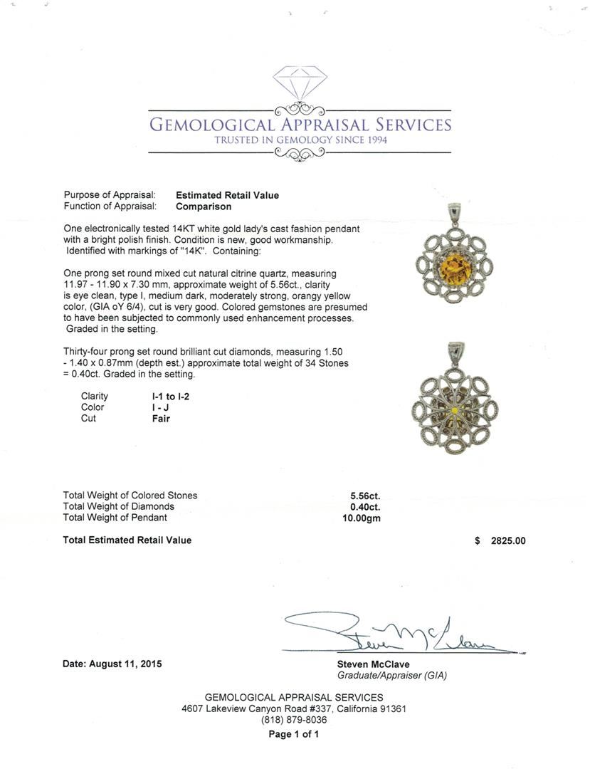 One electronically tested 14KT white gold lady's cast fashion pendant with a bright polish finish. Identified with markings of "14K". Condition is new, good workmanship. Containing: One prong set round mixed cut natural citrine quartz, measuring 11.97 - 11.90 x 7.30 mm, approximate weight of 5.56ct., clarity is eye clean, type I, medium dark, moderately strong, orangy yellow color, (GIA oY 6/4), cut is very good. Colored gemstones are presumed to have been subjected to commonly used enhancement processes. Graded in the setting. Thirty-Four prong set round brilliant cut diamonds, measuring 1.50 - 1.40 x 0.87mm (depth est.) approximate total weight of 34 Stones = 0.40 ct. Graded in the setting. Clarity: I-1 to I-2. Color: I - Fair. Total Weight of Colored Stones 5.56ct. Total Weight of Diamonds 0.40 ct. Total Weight of Pendant 10.00gm. GAS Appraised.