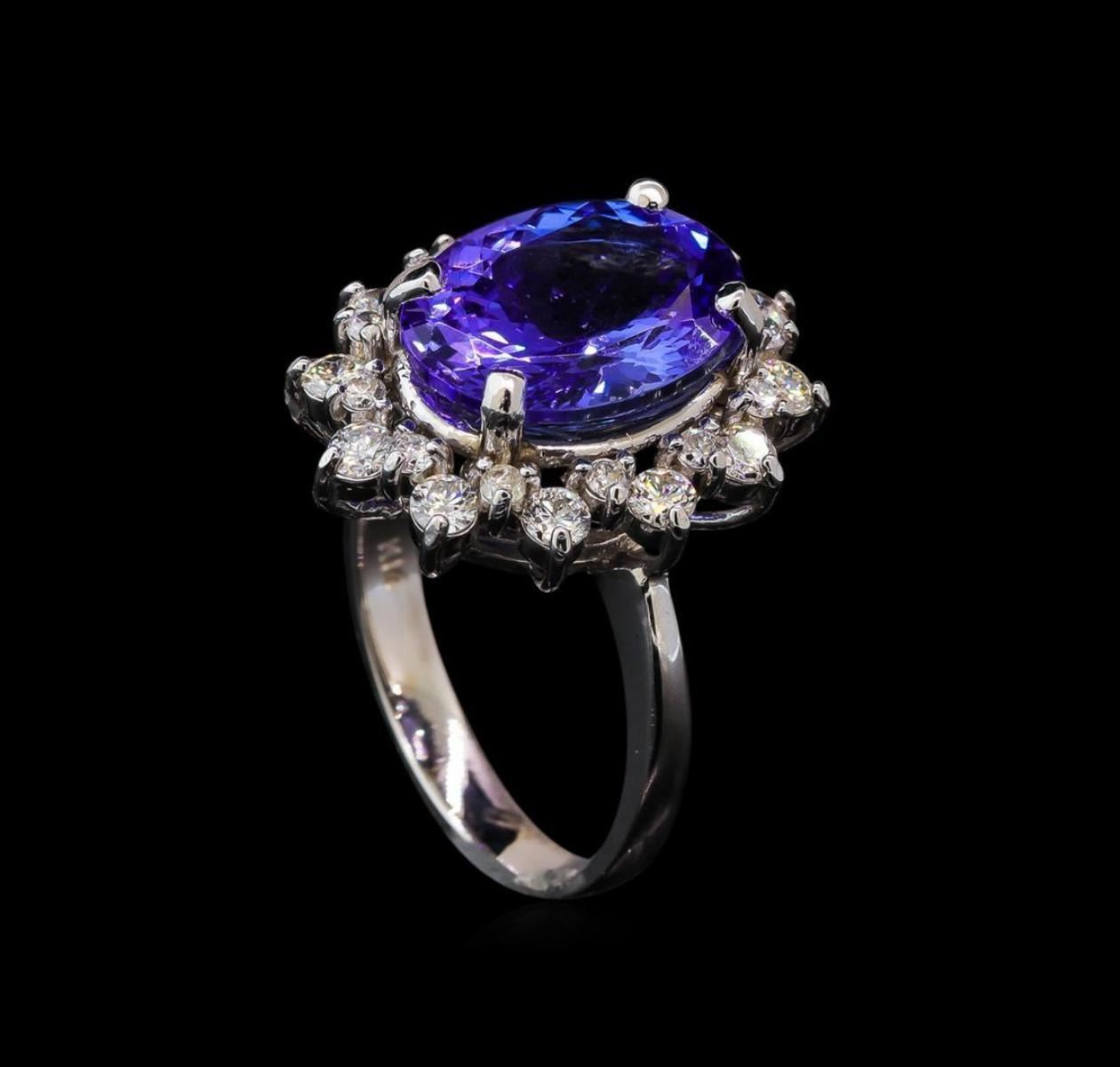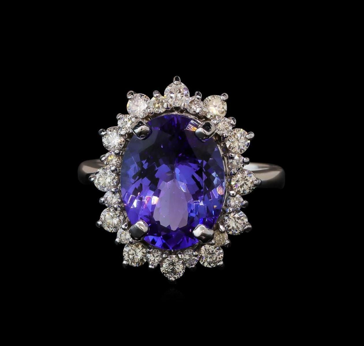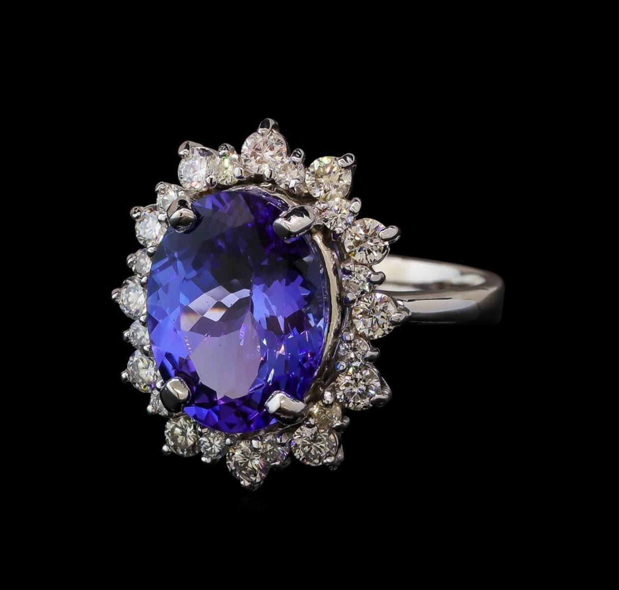 One electronically tested 14KT white gold lady's cast fashion ring with a double basket halo with a bright polish finish. The featured lady's ring has a shank measuring 2.85 millimeters wide. Identified with markings of 'K14'. Condition is new, good workmanship. Containing: One prong set oval modified brilliant cut natural tanzanite, measuring 12.95 x 9.98 x 6.27mm, (depth est.) approximate weight of 5.60ct., clarity is eye clean, medium light, moderately strong, violetish blue color, (GIA vB 4/4), cut is very good. Transmitting light with no distortion, transparent. Colored gemstones are presumed to have been subjected to commonly used enhancement processes. Graded in the setting. Twelve prong set round brilliant cut diamonds, measuring 2.50 - 2.40 x 1.49mm (depth est.) approximate total weight of 12 Stones = 0.65ct. Graded in the setting. Clarity SI-1 to SI-2. Color: H - I Cut Good Twelve prong set round brilliant cut diamonds, measuring 1.80 - 1.70 x 1.09mm (depth est.) approximate total weight of 12 Stones = 0.25ct. Graded in the setting. Clarity SI-1 to I-1. Color: H - I Cut Good. Total Weight of Colored Stones 5.60ct.. Total Weight of Diamonds 0.90ct.. Total Weight of Ring 6.40gm GAS Appraised.