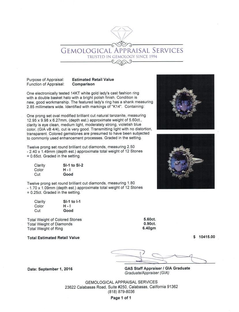 One electronically tested 14KT white gold lady's cast fashion ring with a double basket halo with a bright polish finish. The featured lady's ring has a shank measuring 2.85 millimeters wide. Identified with markings of 'K14'. Condition is new, good workmanship. Containing: One prong set oval modified brilliant cut natural tanzanite, measuring 12.95 x 9.98 x 6.27mm, (depth est.) approximate weight of 5.60ct., clarity is eye clean, medium light, moderately strong, violetish blue color, (GIA vB 4/4), cut is very good. Transmitting light with no distortion, transparent. Colored gemstones are presumed to have been subjected to commonly used enhancement processes. Graded in the setting. Twelve prong set round brilliant cut diamonds, measuring 2.50 - 2.40 x 1.49mm (depth est.) approximate total weight of 12 Stones = 0.65ct. Graded in the setting. Clarity SI-1 to SI-2. Color: H - I Cut Good Twelve prong set round brilliant cut diamonds, measuring 1.80 - 1.70 x 1.09mm (depth est.) approximate total weight of 12 Stones = 0.25ct. Graded in the setting. Clarity SI-1 to I-1. Color: H - I Cut Good. Total Weight of Colored Stones 5.60ct.. Total Weight of Diamonds 0.90ct.. Total Weight of Ring 6.40gm GAS Appraised.