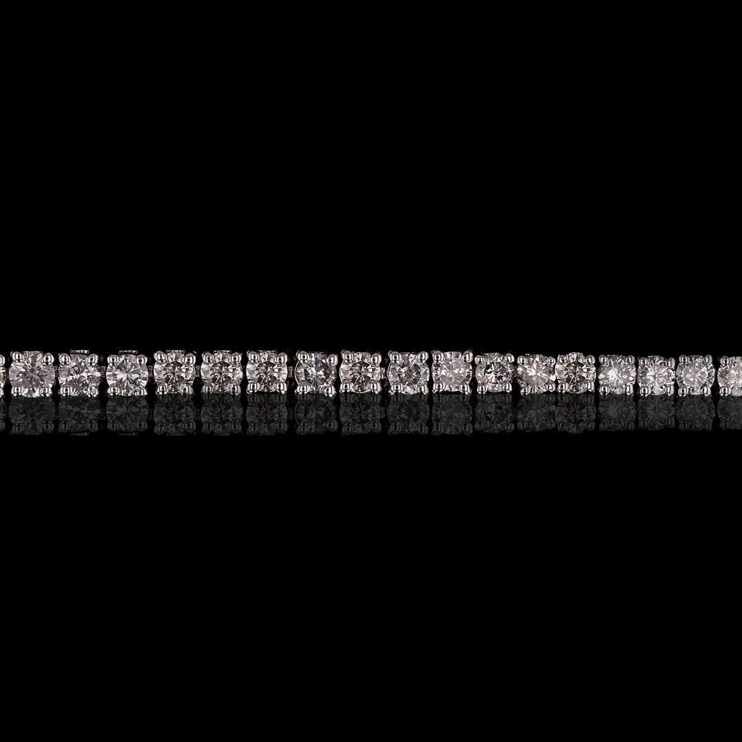 One electronically tested 14KT white gold ladies cast and assembled graduated diamond tennis bracelet. The seven inch length bracelet is composed of a flexible graduating ribbon of diamonds, terminating in a concealed clasp with twin safeties. Identified