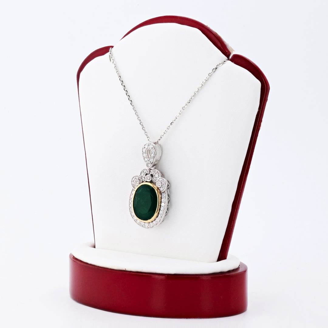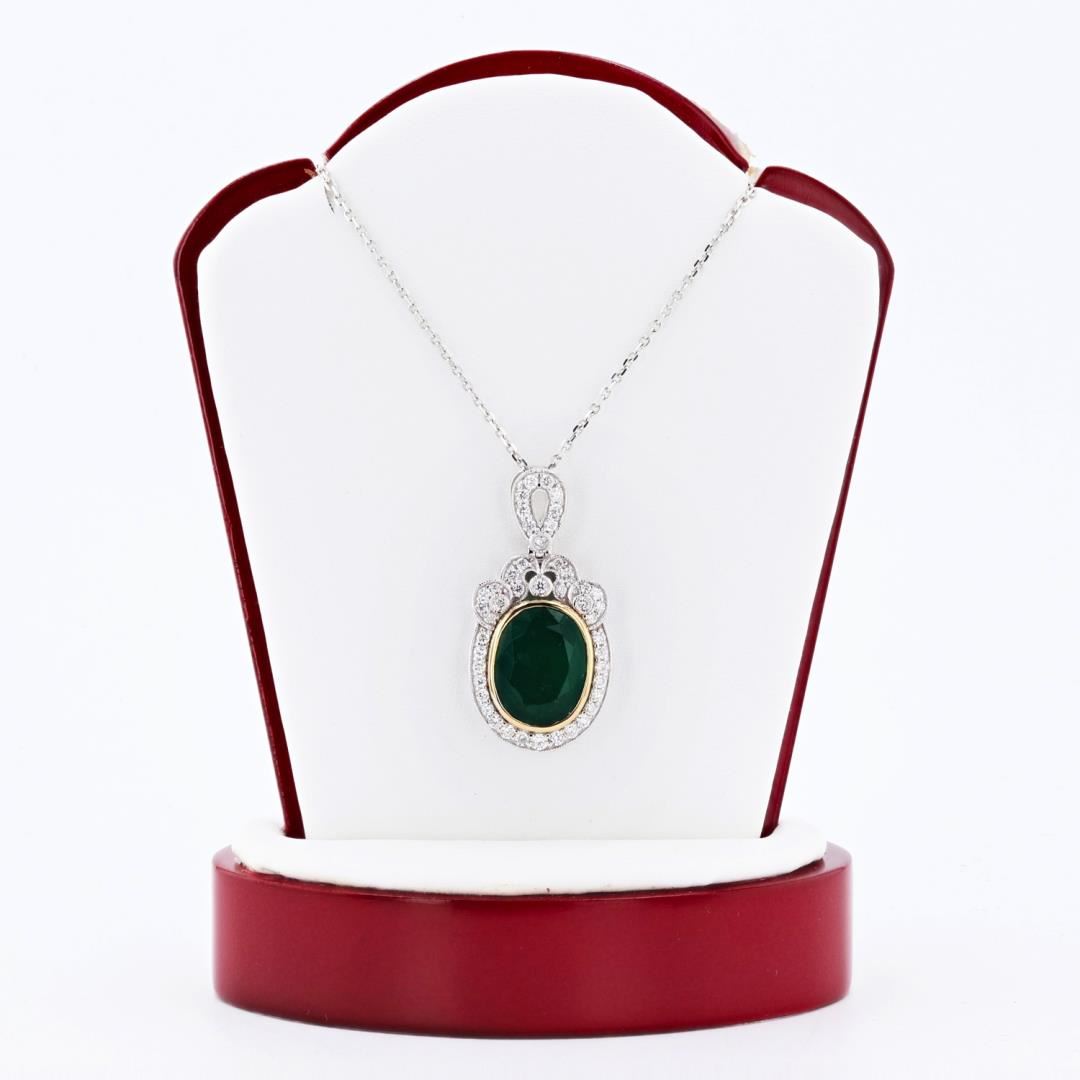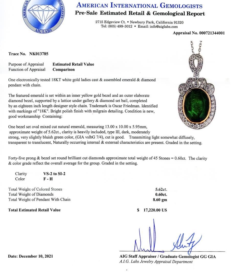 One electronically tested 18KT white gold ladies cast & assembled emerald & diamond pendant with chain. The featured emerald is set within an inner yellow gold bezel and an outer elaborate diamond bezel, supported by a lattice under gallery & diamond set bail, completed by an eighteen inch length designer style chain. Trademark is Oscar Friedman. Identified with markings of "18K". Bright polish finish with milgrain detailing. Condition is new, good workmanship Containing: One bezel set oval mixed cut natural emerald, measuring 13.00 x 10.00 x 5.95mm, approximate weight of 5.62ct., clarity is heavily included, type III, dark, moderately strong, very slightly bluish green color, (GIA vslbG 7/4), cut is good. Transmitting light somewhat diffusely, transparent to translucent, Naturally occurring internal & external characteristics are present. Graded in the setting. Forty-five prong & bezel set round brilliant cut diamonds approximate total weight of 45 Stones = 0.60ctw. The clarity & color grade reflect the overall average for the group. Graded in the setting. Clarity VS2 to SI2 Color F - H Total Weight of Colored Stones 5.62ct. Total Weight of Diamonds 0.60ctw. Total Weight of Pendant With Chain 8.60 gm Size: 18