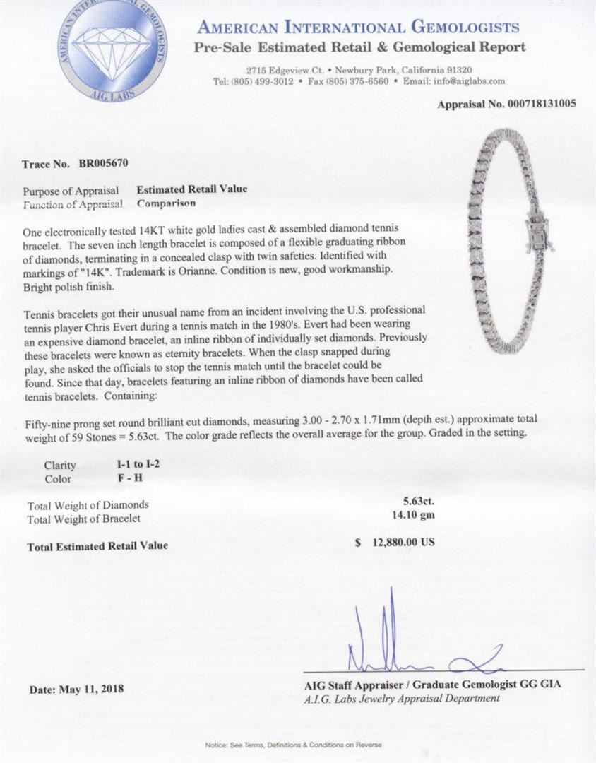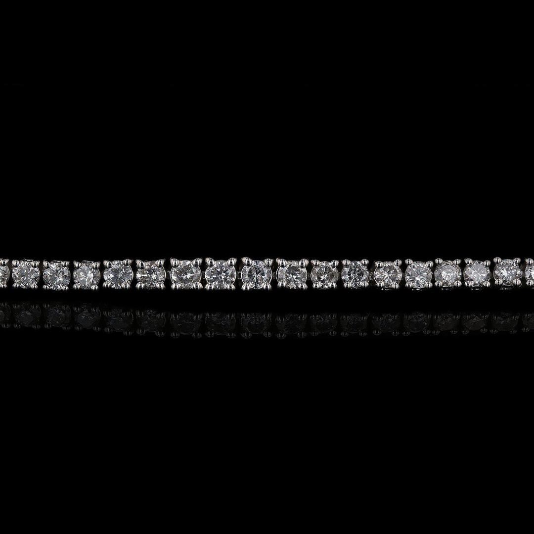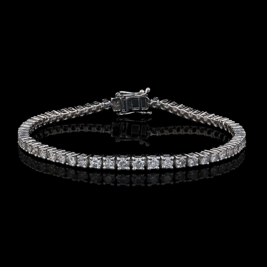One electronically tested 14KT white gold ladies cast and assembled diamond tennis bracelet. The seven inch length bracelet is composed of a flexible graduating ribbon of diamonds, terminating in a concealed clasp with twin safeties. Identified with marki