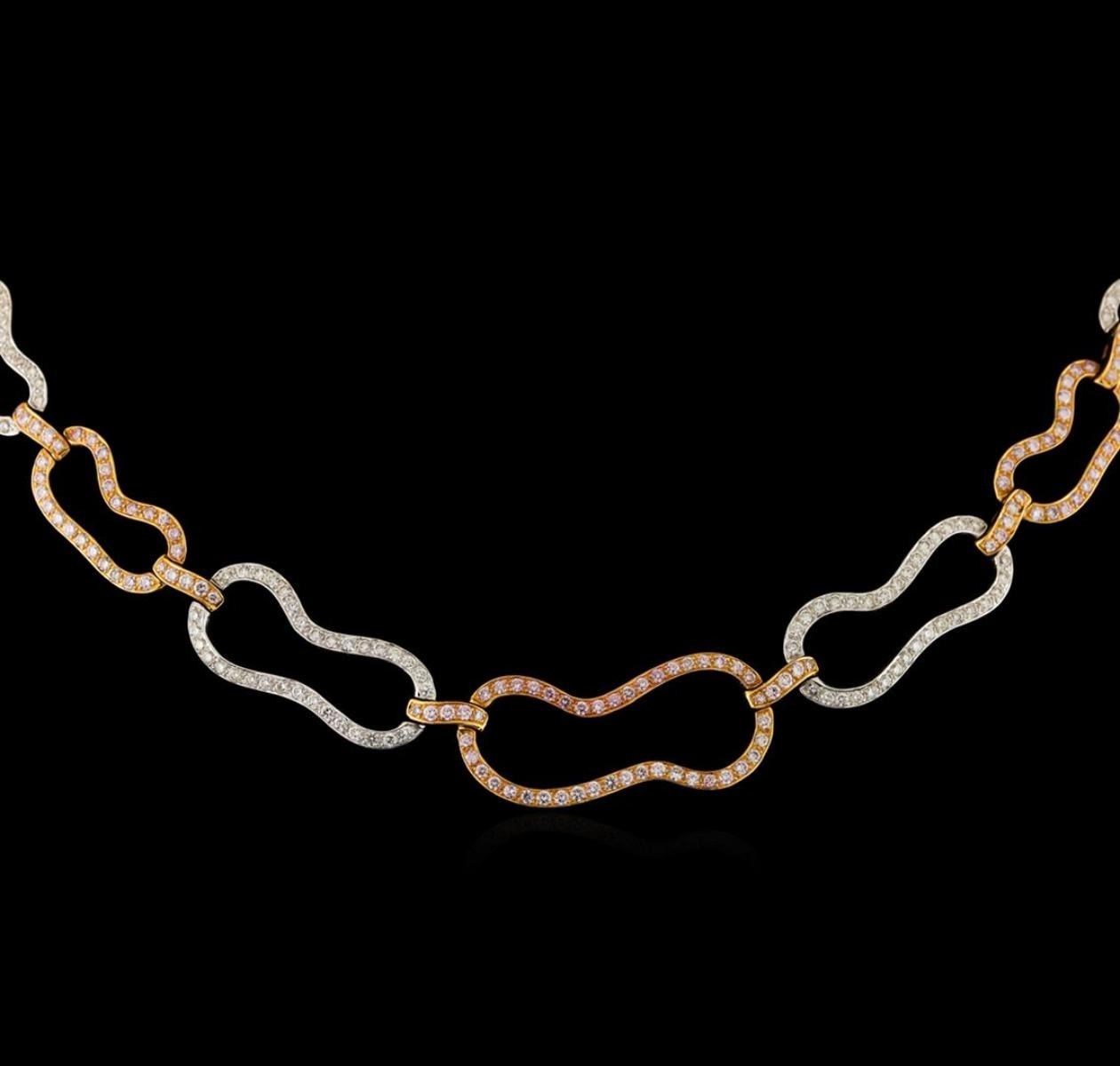 One electronically tested 18KT rose and white gold ladies cast & assembled diamond necklace with a bright polish finish. Sixteen inch wearable length necklace features stylized diamond set rose gold and white gold links, terminating in a concealed clasp with safety. Identified with markings of 750. Condition is new, good workmanship. Containing: Sixty-Four bead set round brilliant cut diamonds, measuring 1.30 - 1.10 x 0.72mm (depth est.) approximate total weight of 64 Stones = 0.50ct. The group is composed of a mix of natural faint pink to light pink color diamonds. Graded in the setting. Clarity: VS-2 to SI-1 Two Hundred Forty-One bead set round brilliant cut diamonds, measuring 1.60 - 1.40 x 0.90mm (depth est.) approximate total weight of 241 Stones = 3.06ct. The group is composed of a mix of natural faint pink to light pink color diamonds. Graded in the setting. Clarity: VS-2 to SI-1 One Hundred Ninety-Eight bead set round brilliant cut diamonds, measuring 1.50 - 1.30 x 0.84mm (depth est.) approximate total weight of 198 Stones = 2.08ct. Graded in the setting. Clarity: VS-2 to SI-1. Color: F - H. Total Weight of Diamonds 5.64ct. Total Weight of Necklace 34.91gm. AIG Appraised.