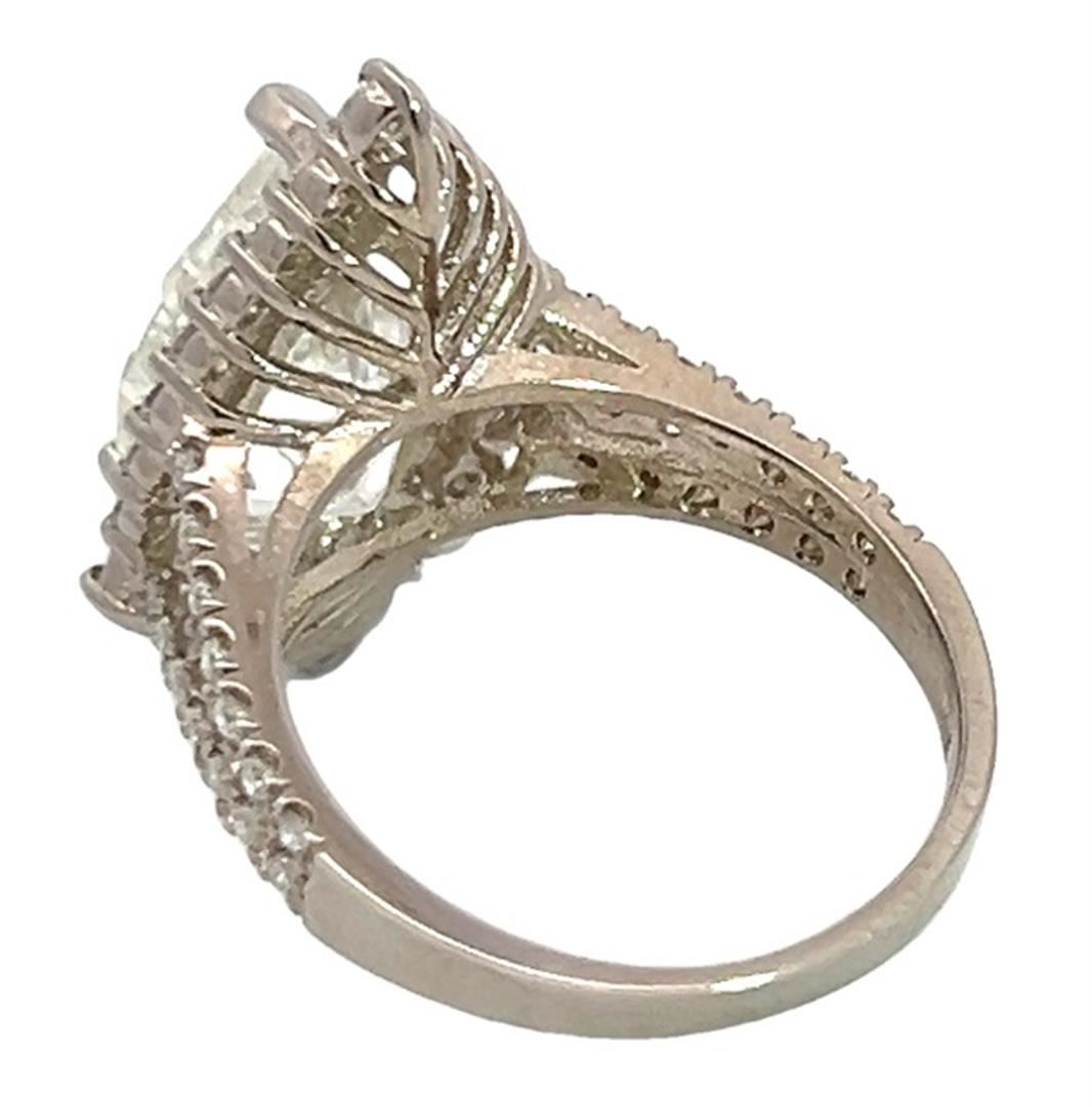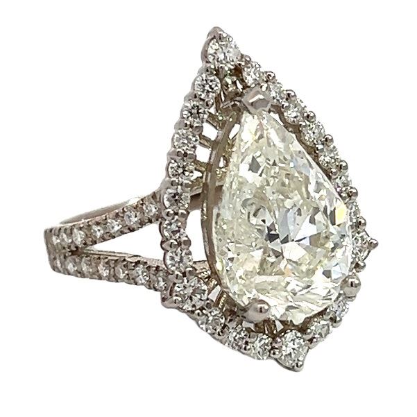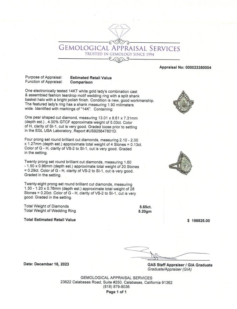 One electronically tested 14KT white gold lady's combination cast & assembled fashion teardrop motif wedding ring with a split shank basket halo with a bright polish finish. The featured lady's ring has a shank measuring 1.90 millimeters wide. Identified with markings of "14K". Condition is new, good workmanship.Containing: One pear shaped cut diamond, measuring 13.01 x 8.61 x 7.31mm (depth est.), 4.00% GTCF approximate weight of 5.03ct. Graded loose prior to setting in the EGL USA Laboratory, Report #US925647801D.Color HClarity SI-1 Cut Very Good Four prong set round brilliant cut diamonds, measuring 2.10 - 2.00 x 1.27mm (depth est.) approximate total weight of 4 Stones = 0.13ct. Graded in the setting.Color G - HClarity VS-2 to SI-1 Cut Very Good Twenty prong set round brilliant cut diamonds, measuring 1.60 - 1.50 x 0.96mm (depth est.) approximate total weight of 20 Stones = 0.29ct. Graded in the setting.Color G - HClarity VS-2 to SI-1 Cut Very Good Twenty-Eight prong set round brilliant cut diamonds, measuring 1.30 - 1.20 x 0.76mm (depth est.) approximate total weight of 28 Stones = 0.20ct. Graded in the setting.Color G - HClarity VS-2 to SI-1 Cut Very Good Total Weight of Diamonds
