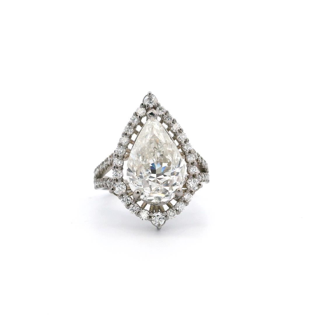 One electronically tested 14KT white gold lady's combination cast & assembled fashion teardrop motif wedding ring with a split shank basket halo with a bright polish finish. The featured lady's ring has a shank measuring 1.90 millimeters wide. Identified with markings of "14K". Condition is new, good workmanship.Containing: One pear shaped cut diamond, measuring 13.01 x 8.61 x 7.31mm (depth est.), 4.00% GTCF approximate weight of 5.03ct. Graded loose prior to setting in the EGL USA Laboratory, Report #US925647801D.Color HClarity SI-1 Cut Very Good Four prong set round brilliant cut diamonds, measuring 2.10 - 2.00 x 1.27mm (depth est.) approximate total weight of 4 Stones = 0.13ct. Graded in the setting.Color G - HClarity VS-2 to SI-1 Cut Very Good Twenty prong set round brilliant cut diamonds, measuring 1.60 - 1.50 x 0.96mm (depth est.) approximate total weight of 20 Stones = 0.29ct. Graded in the setting.Color G - HClarity VS-2 to SI-1 Cut Very Good Twenty-Eight prong set round brilliant cut diamonds, measuring 1.30 - 1.20 x 0.76mm (depth est.) approximate total weight of 28 Stones = 0.20ct. Graded in the setting.Color G - HClarity VS-2 to SI-1 Cut Very Good Total Weight of Diamonds