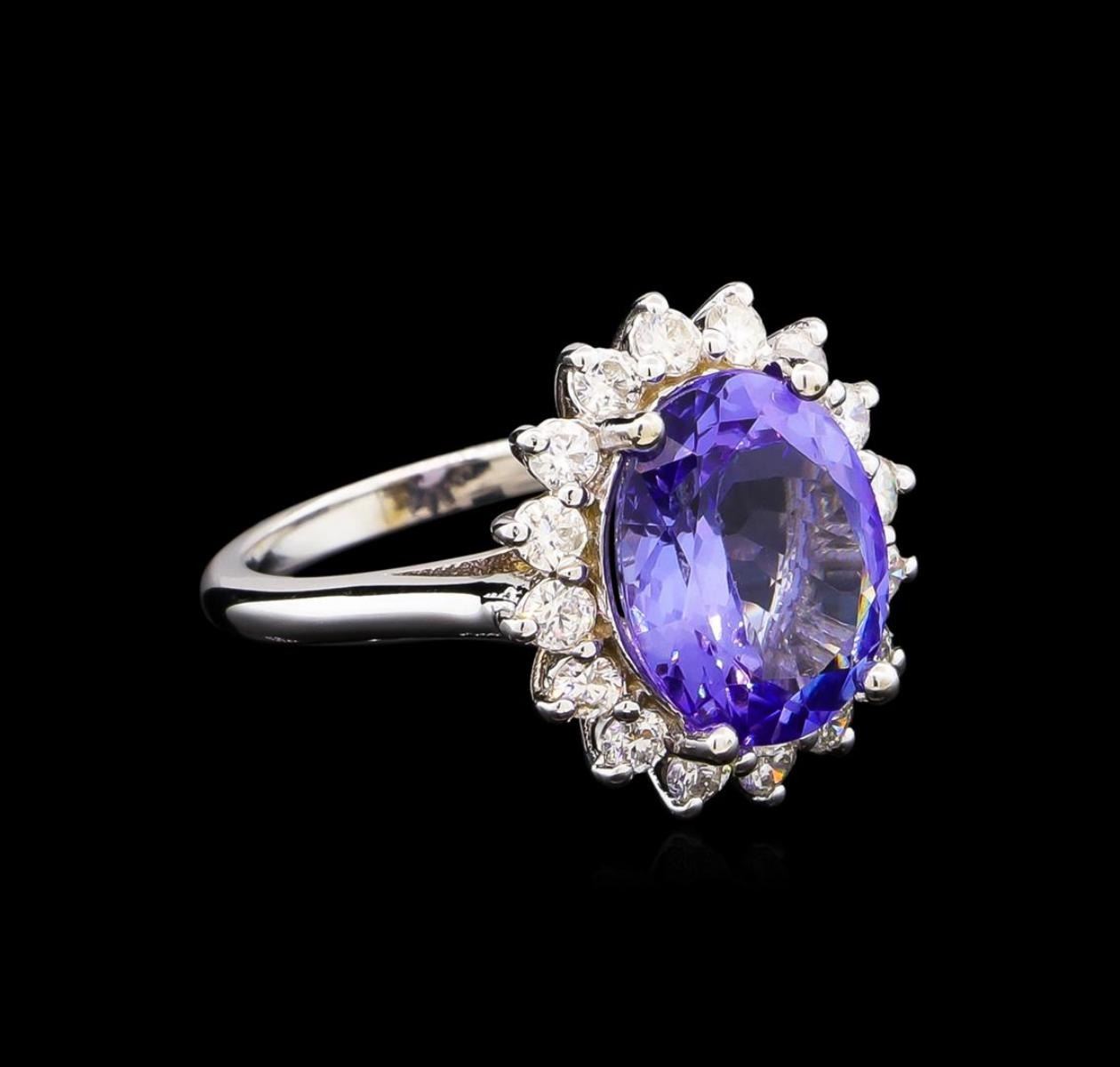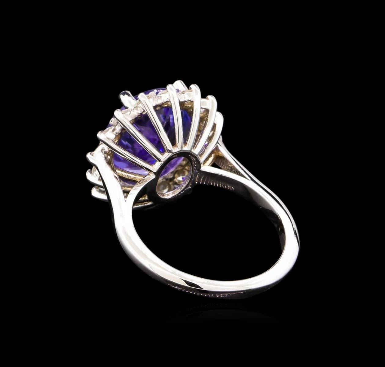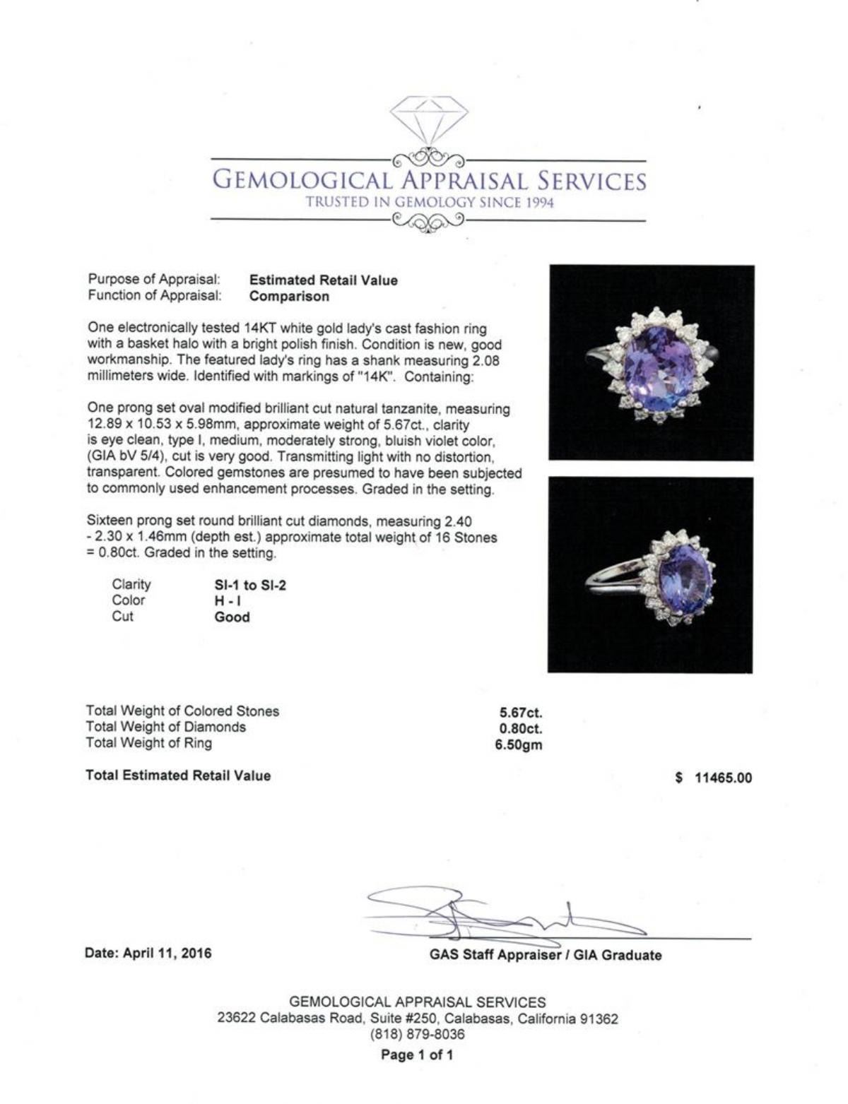 One electronically tested 14KT white gold lady's cast fashion ring with a basket halo with a bright polish finish. The featured lady's ring has a shank measuring 2.08 millimeters wide. Identified with markings of "14K". Condition is new, good workmanship. Containing: One prong set oval modified brilliant cut natural tanzanite, measuring 12.89 x 10.53 x 5.98mm, approximate weight of 5.67ct., clarity is eye clean, type I, medium, moderately strong, bluish violet color, (GIA bV 5/4), cut is very good. Transmitting light with no distortion, transparent. Colored gemstones are presumed to have been subjected to commonly used enhancement processes. Graded in the setting. Sixteen prong set round brilliant cut diamonds, measuring 2.40 - 2.30 x 1.46mm (depth est.) approximate total weight of 16 Stones = 0.80ct. Graded in the setting. Clarity: SI-1 to SI-2. Color: H - I. Cut Good. Total Weight of Colored Stones 5.67ct. Total Weight of Diamonds 0.80ct. Total Weight of Ring 6.50gm. GAS Appraised at $11,465.00.