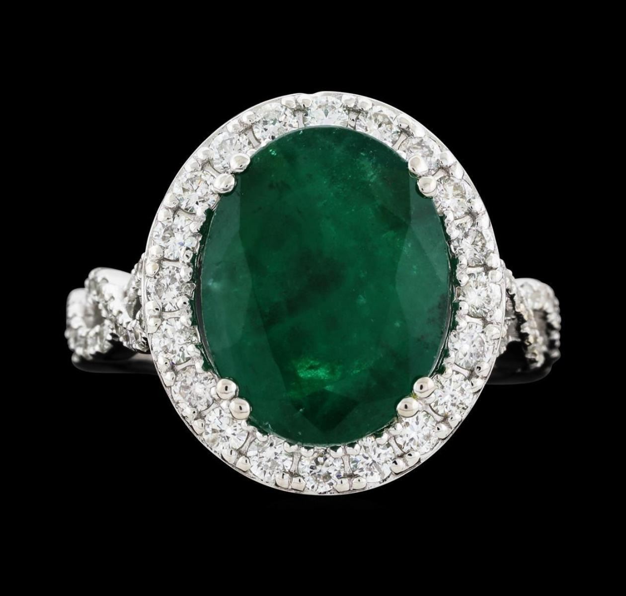 One electronically tested 14KT white gold lady's cast fashion ring with a crossover split shank with a halo with a bright polish finish. The featured lady's ring has a shank measuring 2.64 millimeters wide. Identified with markings of 'K14'. Condition is new, good workmanship. Containing: One prong set oval modified mixed cut natural emerald, measuring 13.43 x 10.37 x 6.03mm, (depth est.) 15%. bulge factor, approximate weight of 5.68ct., clarity is heavily included, medium dark, moderately strong, green color, (GIA G 6/4), cut is good. Transmitting light somewhat diffusely, semi-transparent to translucent. Indications of oil residue. Naturally occurring internal & external characteristics are present. Colored gemstones are presumed to have been subjected to commonly used enhancement processes. Graded in the setting. Twenty prong set round brilliant cut diamonds, measuring 2.00 - 1.90 x 1.17mm (depth est.) approximate total weight of 20 Stones = 0.54ct. Graded in the setting. Clarity SI-1 to I-1. Color: G - I Cut Good Seventy-Six prong set round brilliant cut diamonds, measuring 1.30 - 1.20 x 0.78mm (depth est.) approximate total weight of 76 Stones = 0.57ct. Graded in the setting. Clarity SI-1 to I-1. Color: H - I Cut Good. Total Weight of Colored Stones 5.68ct.. Total Weight of Diamonds 1.11ct.. Total Weight of Ring 7.10gm. GAS Appraised.