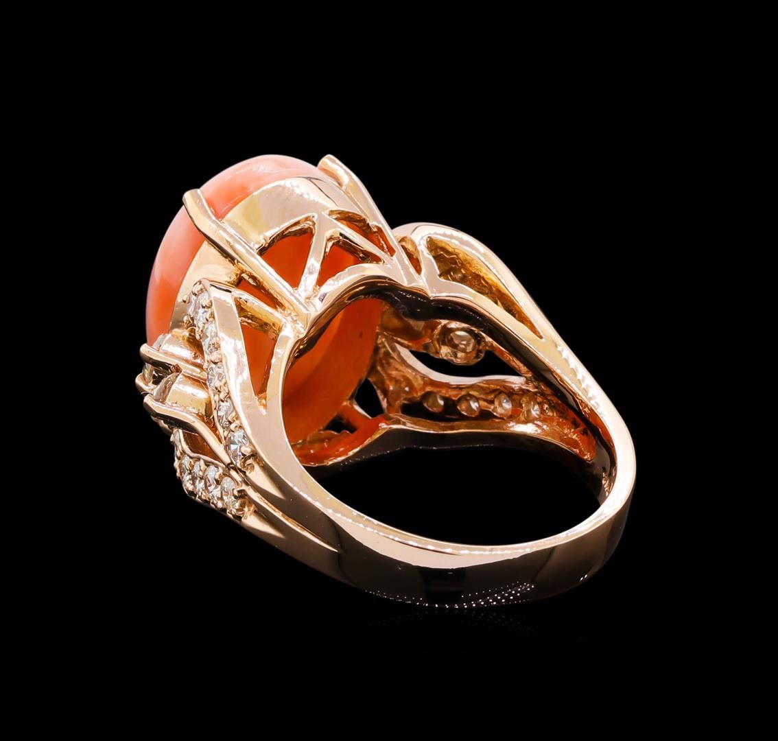 One electronically tested 14KT rose gold lady's cast fashion ring with a split shank with a bright polish finish. The featured lady's ring has a shank measuring 3.69 millimeters in width. Identified with markings of "K14". Condition is new, good workmanship. Containing: One prong set oval cabochon cut natural pink coral, measuring 16.14 x 12.12 x 5.20mm, (depth est.) approximate weight of 5.68ct., orangy red color, (GIA oR 0/0), cut is good. The featured pink coral has a marbled pink and red appearance. Transmitting light diffusely, opaque to translucent. Colored gemstones are presumed to have been subjected to commonly used enhancement processes. Graded in the setting. Sixteen prong set round brilliant cut diamonds, measuring 1.90 - 1.80 x 1.15mm (depth est.) approximate total weight of 16 Stones = 0.38ct. Graded in the setting. Clarity: SI-1 to SI-2. Color: G - Good Four prong set round brilliant cut diamonds, measuring 2.80 - 2.70 x 1.71mm (depth est.) approximate total weight of 4 Stones = 0.36ct. Graded in the setting. Clarity: VS-2 to SI-1. Color: H - I. Cut Very Good. Total Weight of Colored Stones 5.68ct. Total Weight of Diamonds 0.74ct. Total Weight of Ring 10.20gm. GAS Appraised.