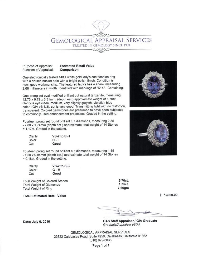 One electronically tested 14KT white gold lady's cast fashion ring with a double basket halo with a bright polish finish. The featured lady's has a shank measuring 2.68 millimeters in width. Identified with markings of "K14". Condition is new, good workmanship. Containing: One prong set oval modified brilliant cut natural tanzanite, measuring 12.73 x 9.72 x 6.31mm, (depth est.) approximate weight of 5.70 ct., clarity is eye clean, medium, very slightly grayish, violetish blue color, (GIA vB 5/3), cut is very good. Transmitting light with no distortion, transparent. Colored gemstones are presumed to have been subjected to commonly used enhancement processes. Graded in the setting. Fourteen prong set round brilliant cut diamonds, measuring 2.85 - 2.80 x 1.74mm (depth est.) approximate total weight of 14 Stones = 1.17ct. Graded in the setting. Clarity: VS-2 to SI-1. Color: H - I. Cut Good Fourteen prong set round brilliant cut diamonds, measuring 1.55 - 1.50 x 0.94mm (depth est.) approximate total weight of 14 Stones = 0.18ct. Graded in the setting. Clarity: VS-2 to SI-2. Color: G - Good. Total Weight of Colored Stones 5.70 ct. Total Weight of Diamonds 1.35ct. Total Weight of Ring 7.60gm. GAS Appraised.