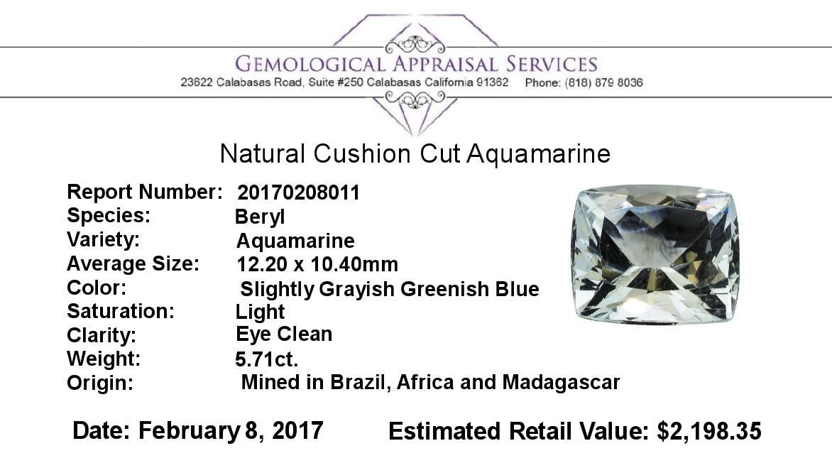 One natural cushion cut aquamarine with an exact weight of 5.71ct., clarity is eye clean, slightly grayish greenish blue, light. Gemological Appraisals Services estimates the retail value at $2198.35 GAS Appraised.