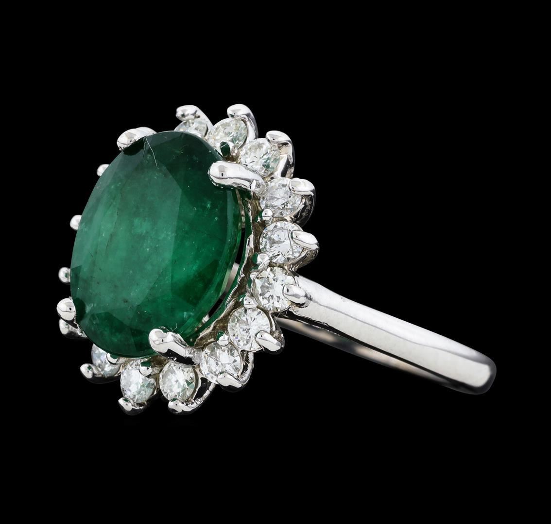 One electronically tested 14KT white gold lady's cast fashion ring with a basket halo with a bright polish finish. The featured lady's ring has a shank measuring 2.08 millimeters wide. Identified with markings of '14K'. Condition is new, good workmanship. Containing: One prong set oval modified mixed cut natural emerald, measuring 12.58 x 9.74 x 5.86mm, (depth est.) 15%. bulge factor, approximate weight of 4.93ct., clarity is heavily included, medium, moderately strong, green color, (GIA G 5/4), cut is good. Transmitting light somewhat diffusely, semi-transparent to translucent. Naturally occurring internal & external characteristics are present. Indications of oil residue. Colored gemstones are presumed to have been subjected to commonly used enhancement processes. Graded in the setting. Sixteen prong set round brilliant cut diamonds, measuring 2.40 - 2.30 x 1.46mm (depth est.) approximate total weight of 16 Stones = 0.80ct. Graded in the setting. Clarity SI-1 to I-1. Color: G - H Cut Good. Total Weight of Colored Stones 4.93ct.. Total Weight of Diamonds 0.80ct.. Total Weight of Ring 6.40gm. GAS Appraised.
