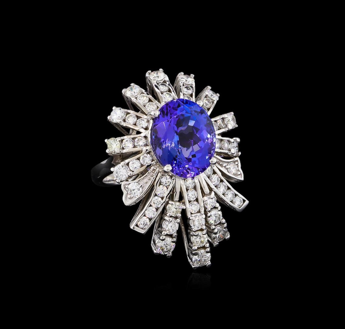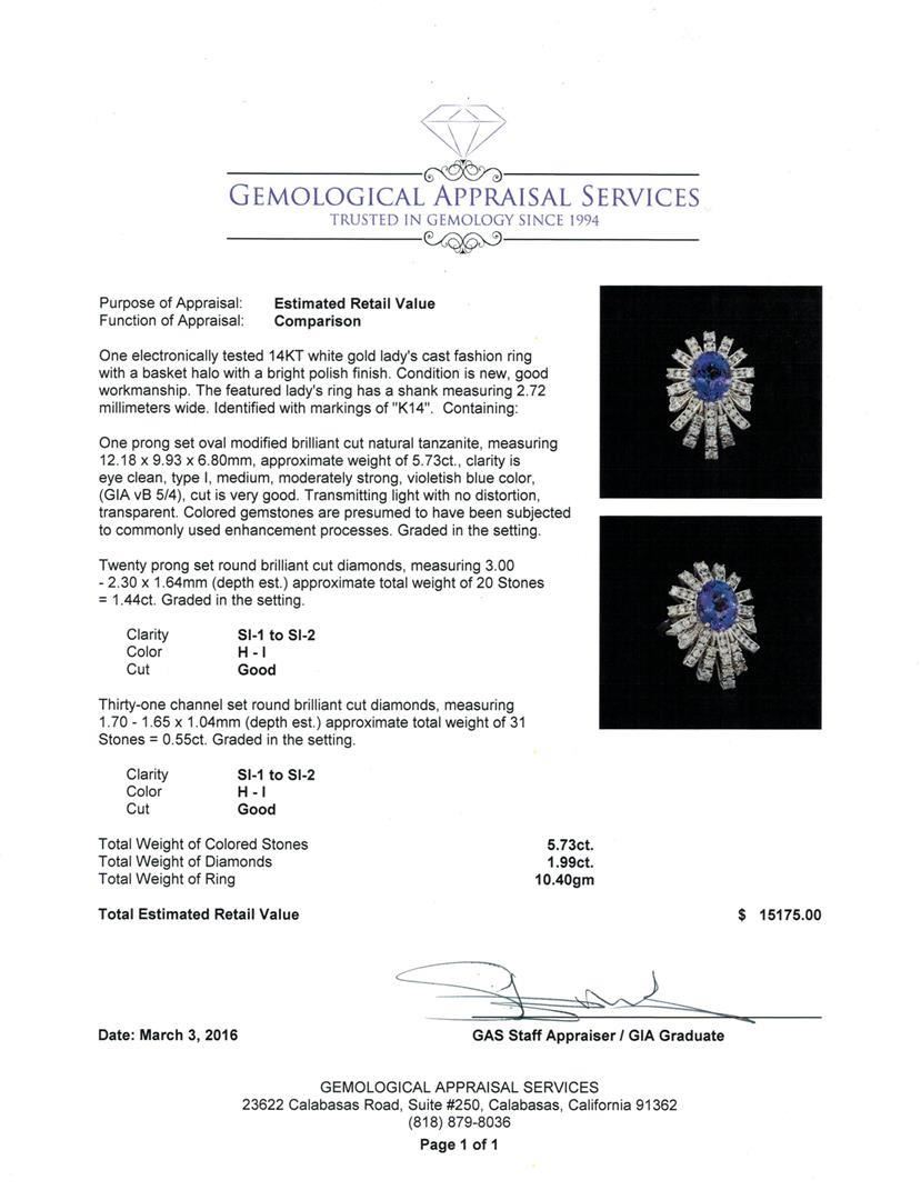 One electronically tested 14KT white gold lady's cast fashion ring with a basket halo with a bright polish finish. The featured lady's ring has a shank measuring 2.72 millimeters wide. Identified with markings of "K14". Condition is new, good workmanship. Containing: One prong set oval modified brilliant cut natural tanzanite, measuring 12.18 x 9.93 x 6.80mm, approximate weight of 5.73ct., clarity is eye clean, type I, medium, moderately strong, violetish blue color, (GIA vB 5/4), cut is very good. Transmitting light with no distortion, transparent. Colored gemstones are presumed to have been subjected to commonly used enhancement processes. Graded in the setting. Twenty prong set round brilliant cut diamonds, measuring 3.00 - 2.30 x 1.64mm (depth est.) approximate total weight of 20 Stones = 1.44ct. Graded in the setting. Clarity: SI-1 to SI-2. Color: H - I. Cut Good Thirty-One channel set round brilliant cut diamonds, measuring 1.70 - 1.65 x 1.04mm (depth est.) approximate total weight of 31 Stones = 0.55ct. Graded in the setting. Clarity: SI-1 to SI-2. Color: H - I. Cut Good. Total Weight of Colored Stones 5.73ct. Total Weight of Diamonds 1.99ct. Total Weight of Ring 10.40gm. GAS Appraised.