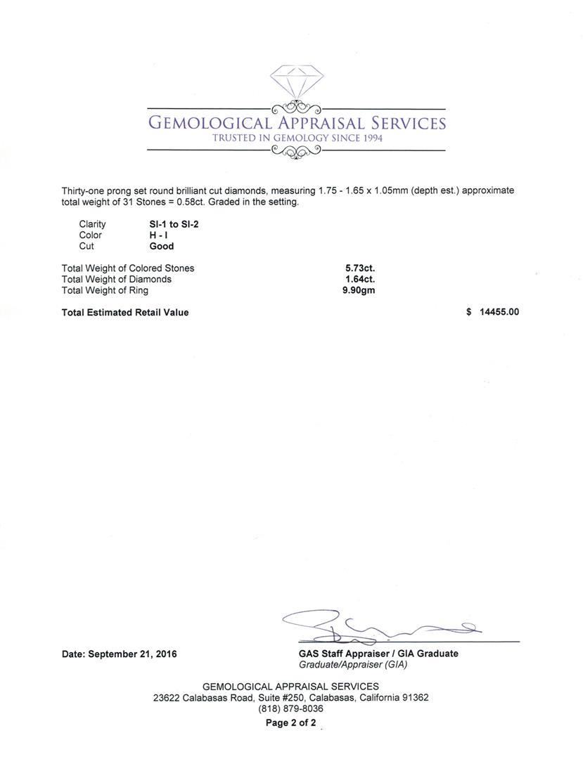 One electronically tested 14KT white gold lady's cast fashion ring with a bright polish finish. The featured lady's ring has a starburst motif and a shank measuring 2.48 millimeters wide. Identified with markings of 'K14'. Condition is new, good workmanship. Containing: One prong set oval modified brilliant cut natural tanzanite, measuring 13.88 x 9.80 x 5.63mm, (depth est.) 6%. bulge factor, approximate total weight of 5.73ct., clarity is eye clean, medium, moderately strong, violetish blue color, (GIA vB 5/4), cut is very good. Transmitting light with no distortion, transparent. Colored gemstones are presumed to have been subjected to commonly used enhancement processes. Graded in the setting. Three prong set round brilliant cut diamonds, measuring 3.00 - 2.90 x 1.77mm (depth est.) approximate total weight of 3 Stones = 0.28ct. Graded in the setting. Clarity SI-1 to SI-2. Color: H - I Cut Good Three prong set round brilliant cut diamonds, measuring 2.70 - 2.60 x 1.59mm (depth est.) approximate total weight of 3 Stones = 0.20ct. Graded in the setting. Clarity SI-1 to SI-2. Color: H - I Cut Good Fourteen prong set round brilliant cut diamonds, measuring 2.30 - 2.20 x 1.35mm (depth est.) approximate total weight of 14 Stones = 0.58ct. Graded in the setting. Clarity SI-1 to SI-2. Color: H - I Cut Good Thirty-One prong set round brilliant cut diamonds, measuring 1.75 - 1.65 x 1.05mm (depth est.) approximate total weight of 31 Stones = 0.58ct. Graded in the setting. Clarity SI-1 to SI-2. Color: H - I Cut Good. Total Weight of Colored Stones 5.73ct.. Total Weight of Diamonds 1.64ct.. Total Weight of Ring 9.90gm. GAS Appraised.
