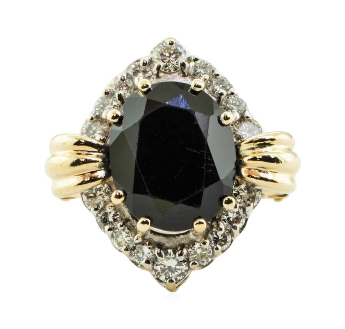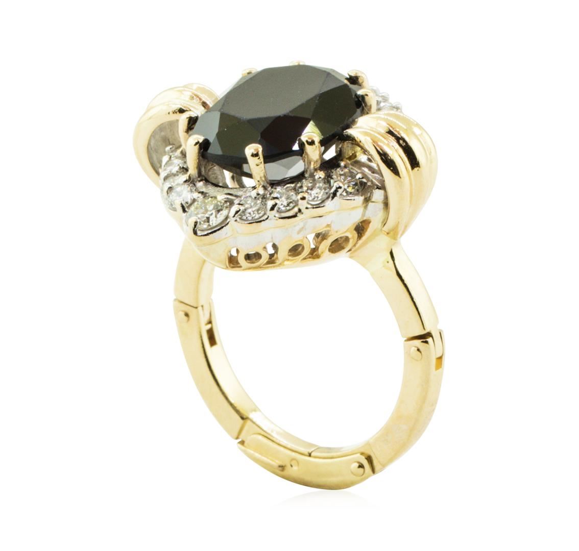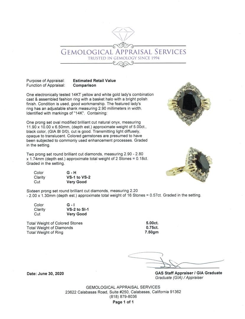 One electronically tested 14KT yellow and white gold lady's combination cast & assembled fashion ring with a basket halo with a bright polish finish. The featured lady's ring has an adjustable shank measuring 2.90 millimeters in width. Identified with markings of '14K'. Condition is used, good workmanship. Containing: One prong set oval modified brilliant cut natural onyx, measuring 11.90 x 10.00 x 6.50mm, (depth est.) approximate weight of 5.00ct., black color, (GIA Bl 0/0), cut is good. Transmitting light diffusely, opaque to translucent. Colored gemstones are presumed to have been subjected to commonly used enhancement processes. Graded in the setting. Two prong set round brilliant cut diamonds, measuring 2.90 - 2.80 x 1.74mm (depth est.) approximate total weight of 2 Stones = 0.18ct. Graded in the setting. Color G - H Clarity VS-1 to VS-2 Cut Very Good Sixteen prong set round brilliant cut diamonds, measuring 2.20 - 2.00 x 1.30mm (depth est.) approximate total weight of 16 Stones = 0.57ct. Graded in the setting. Color G - I Clarity VS-2 to SI-1 Cut Very Good. Total Weight of Colored Stones 5.00ct.. Total Weight of Diamonds 0.75ct.. Total Weight of Ring 7.50gm GAS Appraised at $2590.00. GAS Appraised.