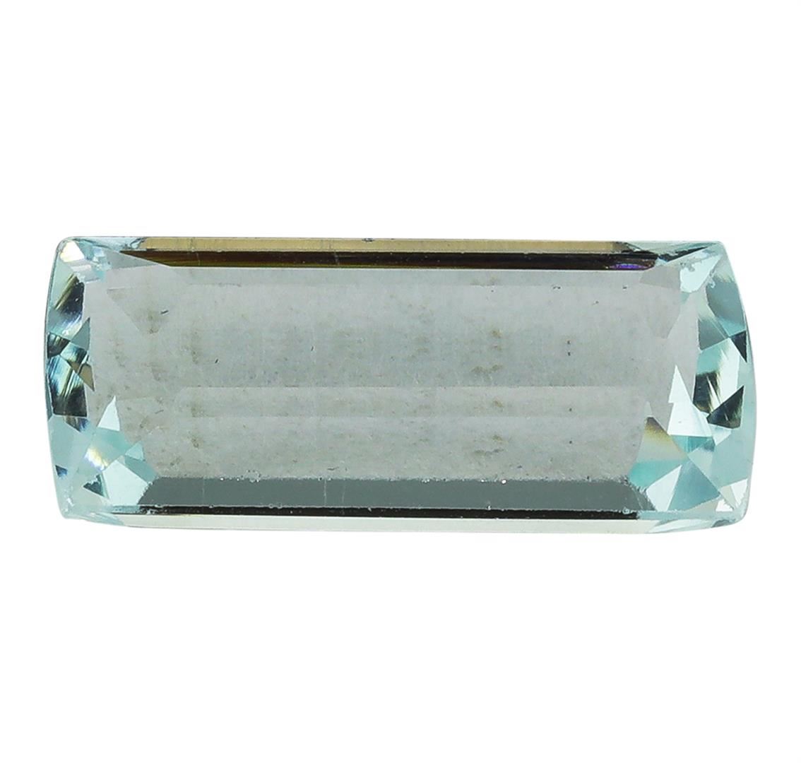 One natural cushion cut aquamarine with an exact weight of 5.76ct., clarity is eye clean, slightly grayish greenish blue, light. Gemological Appraisals Services estimates the retail value at $2217.6 GAS Appraised.