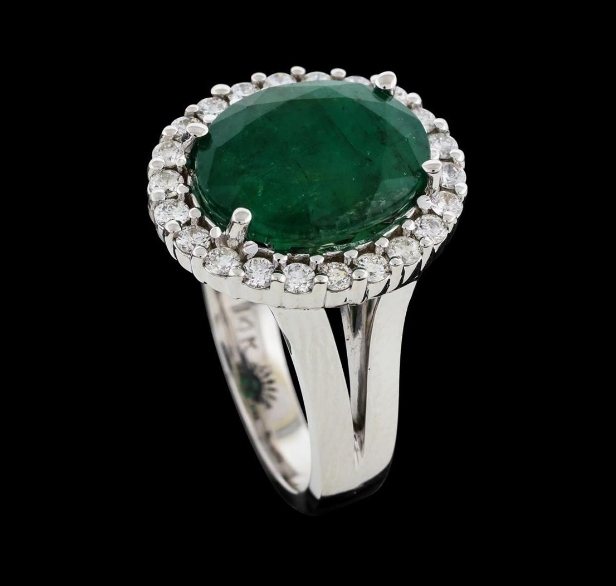One electronically tested 14KT white gold lady's cast fashion ring with a split shank basket halo with a bright polish finish. The featured lady's ring has a shank measuring 3.29 millimeters wide. Identified with markings of '14K'. Condition is new, good workmanship. Containing: One prong set oval modified mixed cut natural emerald, measuring 13.24 x 10.86 x 6.40mm, (depth est.) 10%. bulge factor, approximate weight of 5.76ct., clarity is heavily included, medium dark, moderately strong, green color, (GIA G 6/4), cut is good. Transmitting light somewhat diffusely, semi-transparent to translucent. Indications of oil residue. Naturally occurring internal & external characteristics are present. Colored gemstones are presumed to have been subjected to commonly used enhancement processes. Graded in the setting. Twenty-Two prong set round brilliant cut diamonds, measuring 2.00 - 1.90 x 1.19mm (depth est.) approximate total weight of 22 Stones = 0.60ct. Graded in the setting. Clarity SI-1 to SI-3. Color: H - I Cut Good. Total Weight of Colored Stones 5.76ct.. Total Weight of Diamonds 0.60ct.. Total Weight of Ring 10.20gm. GAS Appraised.