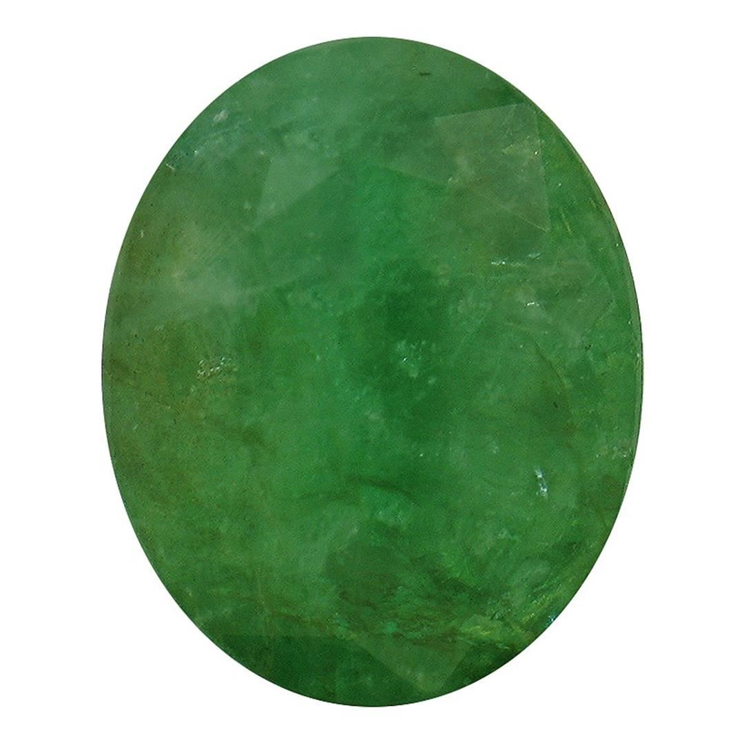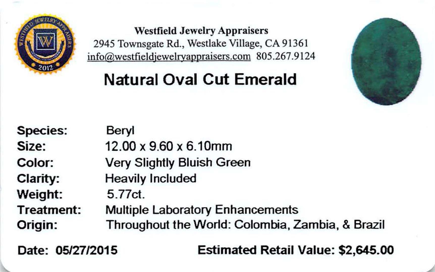 One oval mixed cut natural emerald, measuring 12.00 x 9.60 x 6.10mm, exact weight 5.77ct., clarity is heavily included, medium dark, very slightly grayish, very slightly bluish green color, (GIA vslbG 6/3), cut is good. Transmitting light somewhat diffusely, translucent, Naturally occurring internal & external characteristics are present, Indications of multiple laboratory enhancements, including high temperature heat treatment. Westfield Appraised.