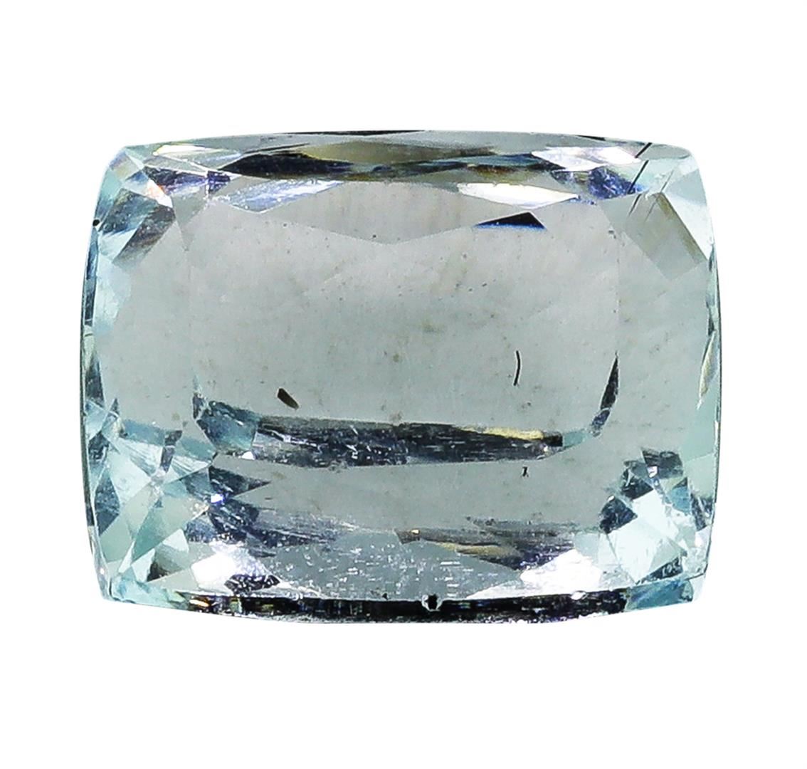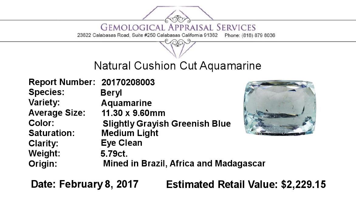 One natural cushion cut aquamarine with an exact weight of 5.79ct., clarity is eye clean, slightly grayish greenish blue, medium light. Gemological Appraisals Services estimates the retail value at $2229.15 GAS Appraised.