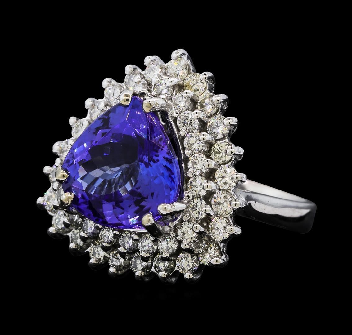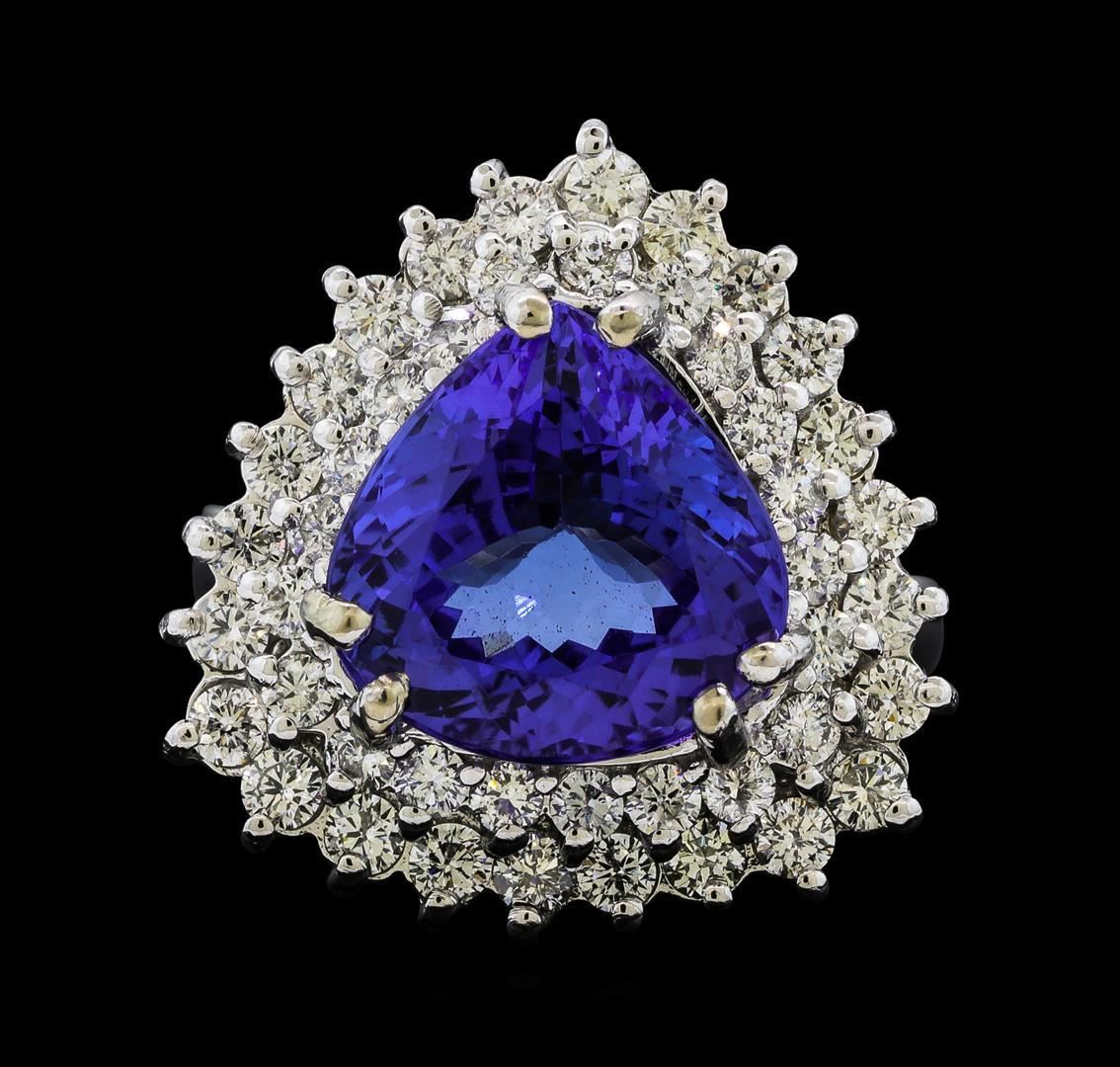 One electronically tested 14KT white gold lady's cast fashion ring with a double basket halo with a bright polish finish. The featured lady's ring has a shank measuring 2.67 millimeters wide. Identified with markings of 'K14'. Condition is new, good workmanship. Containing: One prong set pear modified brilliant cut natural tanzanite, measuring 11.55 x 11.62 x 6.47mm, (depth est.) approximate weight of 5.79ct., clarity is eye clean, medium, moderately strong, violet color, (GIA V 5/4), cut is very good. Transmitting light with no distortion, transparent. Colored gemstones are presumed to have been subjected to commonly used enhancement processes. Graded in the setting. Twenty-Four prong set round brilliant cut diamonds, measuring 2.10 - 2.05 x 1.27mm (depth est.) approximate total weight of 24 Stones = 0.80ct. Graded in the setting. Clarity SI-1 to SI-2. Color: H - I Cut Good Twenty-One prong set round brilliant cut diamonds, measuring 1.90 - 1.80 x 1.15mm (depth est.) approximate total weight of 21 Stones = 0.51ct. Graded in the setting. Clarity SI-1 to SI-2. Color: H - I Cut Good. Total Weight of Colored Stones 5.79ct.. Total Weight of Diamonds 1.31ct.. Total Weight of Ring 10.00gm. GAS Appraised.