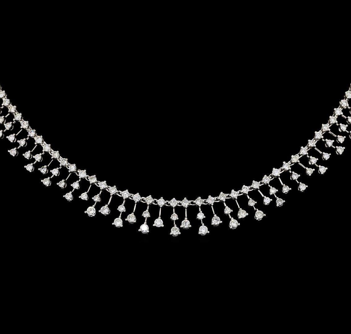 One electronically tested 18KT white gold lady's combination cast & assembled fashion necklace with a tongue clasp with foldover safety with a bright polish finish. The featured lady's necklace measures approximately sixteen inches in length. Identified with markings of '18K'. Condition is new, good workmanship. Containing: Thirteen prong set round brilliant cut diamonds, measuring 2.90 - 2.80 x 1.77mm (depth est.) approximate total weight of 13 Stones = 1.14ct. Graded in the setting. Color H - I Clarity SI-1 to I-1 Cut Good One Hundred Ten prong set round brilliant cut diamonds, measuring 2.30 - 2.20 x 1.37mm (depth est.) approximate total weight of 110 Stones = 4.66ct. Graded in the setting. Color H - I Clarity SI-1 to I-1 Cut Good. Total Weight of Diamonds 5.80ct.. Total Weight of Necklace 26.90gm GAS Appraised at $15460.00. GAS Appraised.
