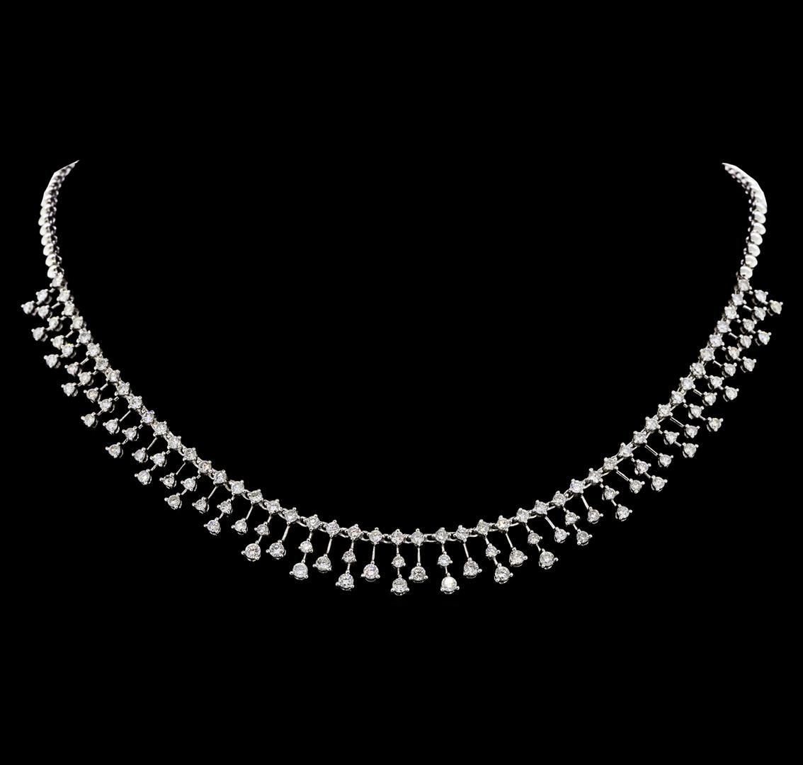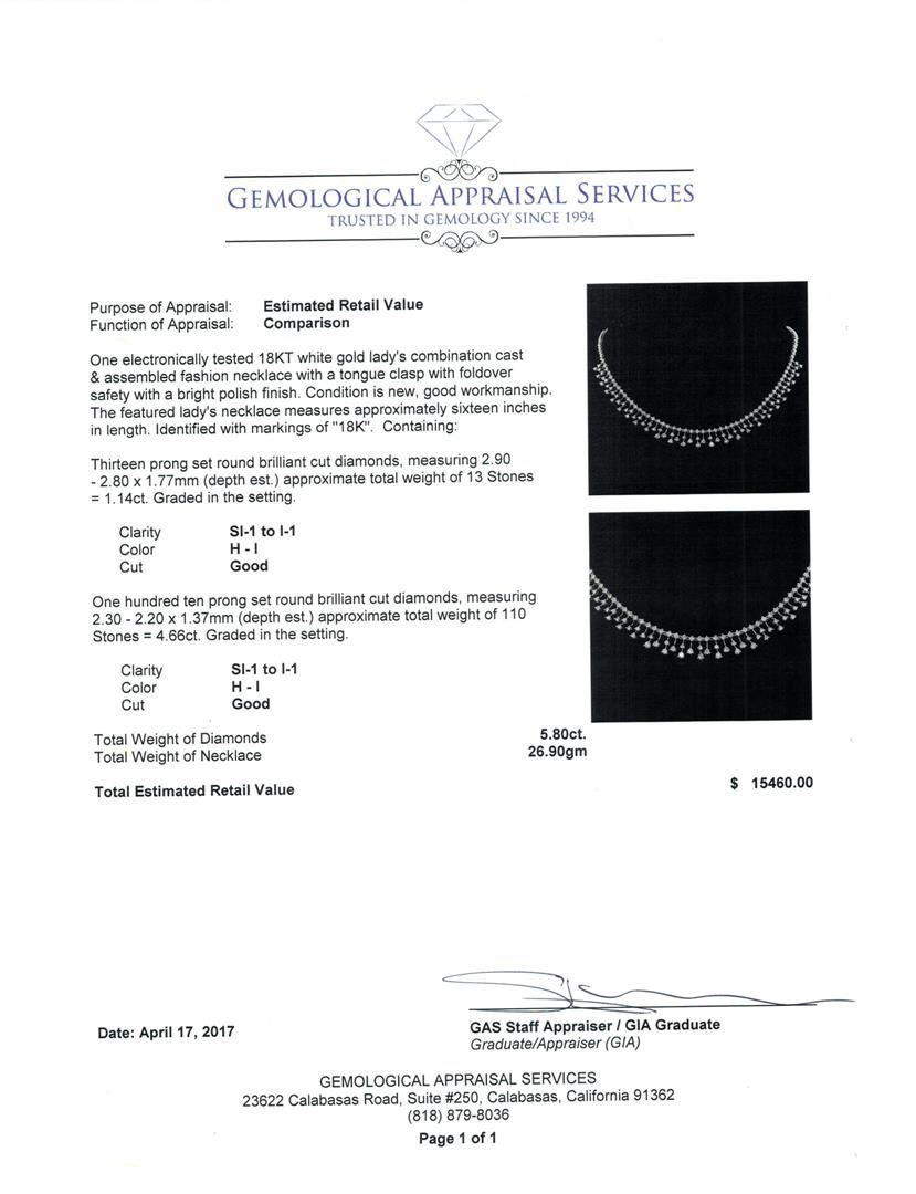 One electronically tested 18KT white gold lady's combination cast & assembled fashion necklace with a tongue clasp with foldover safety with a bright polish finish. The featured lady's necklace measures approximately sixteen inches in length. Identified with markings of '18K'. Condition is new, good workmanship. Containing: Thirteen prong set round brilliant cut diamonds, measuring 2.90 - 2.80 x 1.77mm (depth est.) approximate total weight of 13 Stones = 1.14ct. Graded in the setting. Color H - I Clarity SI-1 to I-1 Cut Good One Hundred Ten prong set round brilliant cut diamonds, measuring 2.30 - 2.20 x 1.37mm (depth est.) approximate total weight of 110 Stones = 4.66ct. Graded in the setting. Color H - I Clarity SI-1 to I-1 Cut Good. Total Weight of Diamonds 5.80ct.. Total Weight of Necklace 26.90gm GAS Appraised at $15460.00. GAS Appraised.