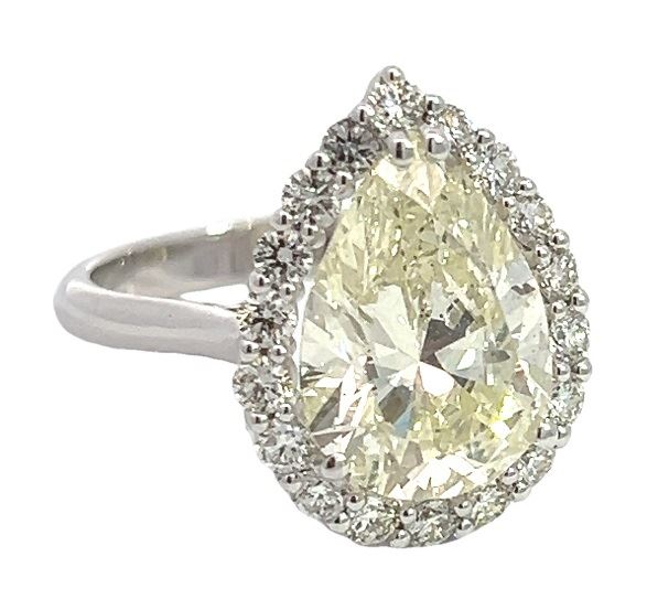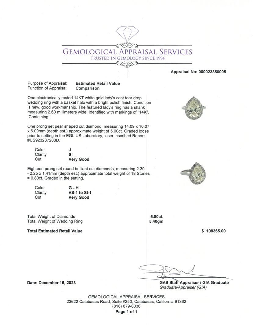 One electronically tested 14KT white gold lady's cast tear drop wedding ring with a basket halo with a bright polish finish. The featured lady's ring has a shank measuring 2.60 millimeters wide. Identified with markings of "14K". Condition is new, good workmanship. Containing: One prong set pear shaped cut diamond, measuring 14.09 x 10.07 x 6.09mm (depth est.) approximate weight of 5.00ct. Graded loose prior to setting in the EGL US Laboratory, laser inscribed Report #US923237203D. Color J Clarity SI Cut Very Good Eighteen prong set round brilliant cut diamonds, measuring 2.30 - 2.25 x 1.41mm (depth est.) approximate total weight of 18 Stones = 0.80ct. Graded in the setting. Color G - H Clarity VS-1 to SI-1 Cut Very Good Total Weight of Diamonds 5.80ct. Total Weight of Wedding Ring 5.40gm Estimated Retail Value $ 108365.00