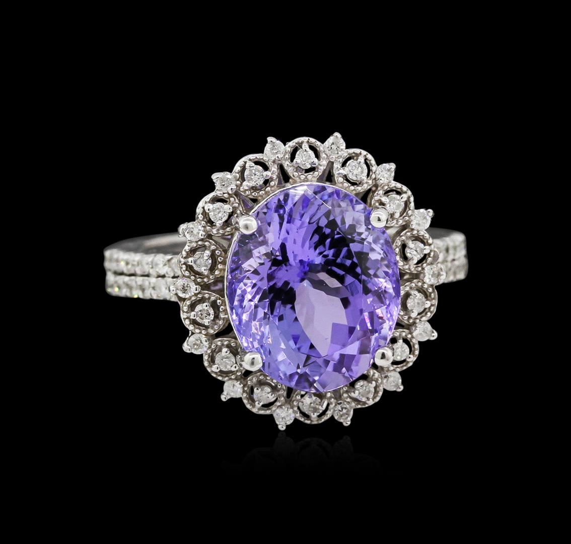 One electronically tested 14KT white gold lady's cast fashion ring with a split shank halo with a bright polish finish. The featured lady's ring has a shank measuring 2.78 millimeters wide. Identified with markings of "K14". Condition is new, good workmanship. Containing: One prong set oval modified brilliant cut natural tanzanite, measuring 12.00 x 9.87 x 7.34mm, approximate weight of 5.80ct., clarity is eye clean, type I, medium light, moderately strong, bluish violet color, (GIA bV 4/4), cut is very good. Transmitting light with no distortion, transparent. Colored gemstones are presumed to have been subjected to commonly used enhancement processes. Graded in the setting. Fifty-Six prong set round brilliant cut diamonds, measuring 1.25 - 1.20 x 0.74mm (depth est.) approximate total weight of 56 Stones = 0.38ct. Graded in the setting. Clarity: SI-1 to I-1. Color: G - Good. Total Weight of Colored Stones 5.80ct. Total Weight of Diamonds 0.38ct. Total Weight of Ring 6.40gm. GAS Appraised at $9,750.00.