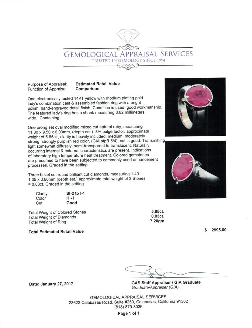 One electronically tested 14KT yellow with rhodium plating gold lady's combination cast & assembled fashion ring with a bright polish, hand-engraved detail finish. The featured lady's ring has a shank measuring 3.82 millimeters wide. Condition is used, good workmanship. Containing: One prong set oval modified mixed cut natural ruby, measuring 11.80 x 9.50 x 6.03mm, (depth est.) 3%. bulge factor, approximate weight of 5.85ct., clarity is heavily included, medium, moderately strong, strongly purplish red color, (GIA stpR 5/4), cut is good. Transmitting light somewhat diffusely, semi-transparent to translucent. Naturally occurring internal & external characteristics are present. Indications of laboratory high temperature heat treatment. Colored gemstones are presumed to have been subjected to commonly used enhancement processes. Graded in the setting. Three bezel set round brilliant cut diamonds, measuring 1.40 - 1.35 x 0.86mm (depth est.) approximate total weight of 3 Stones = 0.03ct. Graded in the setting. Color H - I Clarity SI-2 to I-1 Cut Good. Total Weight of Colored Stones 5.85ct.. Total Weight of Diamonds 0.03ct.. Total Weight of Ring 7.20gm. GAS Appraised.