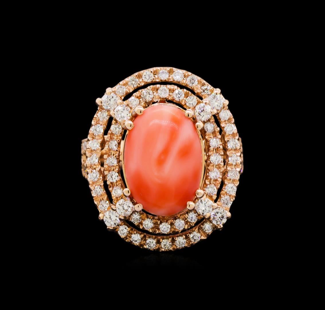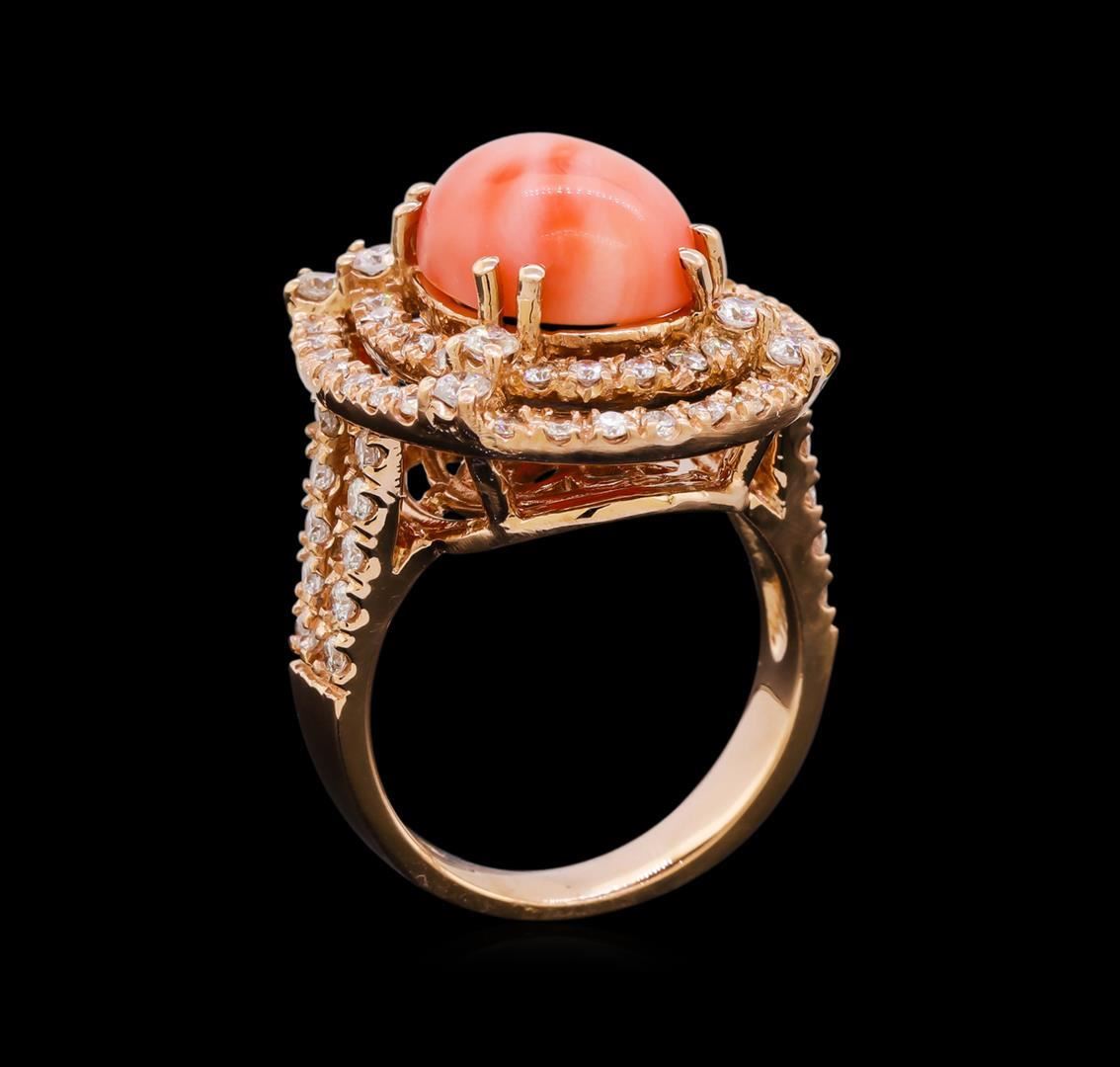 One electronically tested 14KT rose gold lady's cast fashion ring with a split shank double basket halo with a bright polish finish. The featured lady's ring has a shank measuring 3.82 millimeters in width. Identified with markings of "K14". Condition is new, good workmanship. Containing: One prong set oval cabochon cut natural pink coral, measuring 14.05 x 10.48 x 5.20mm, (depth est.) 7%. bulge factor, approximate weight of 5.89ct., orangy red color, (GIA oR 0/0), cut is good. The featured pink coral has a marbled pink and red appearance. Transmitting light diffusely, opaque to translucent. Colored gemstones are presumed to have been subjected to commonly used enhancement processes. Graded in the setting. Eight prong set round brilliant cut diamonds, measuring 2.30 - 2.20 x 1.40mm (depth est.) approximate total weight of 8 Stones = 0.35ct. Graded in the setting. Clarity: VS-2 to SI-1. Color: G - Very Good Forty-Eight prong set round brilliant cut diamonds, measuring 1.50 - 1.40 x 0.90mm (depth est.) approximate total weight of 48 Stones = 0.58ct. Graded in the setting. Clarity: VS-2 to SI-1. Color: G - Good Twenty prong set round brilliant cut diamonds, measuring 1.80 - 1.70 x 1.05mm (depth est.) approximate total weight of 20 Stones = 0.40ct. Graded in the setting. Clarity: VS-2 to SI-2. Color: G - Good. Total Weight of Colored Stones 5.89ct. Total Weight of Diamonds 1.33ct. Total Weight of Ring 12.00gm. GAS Appraised.