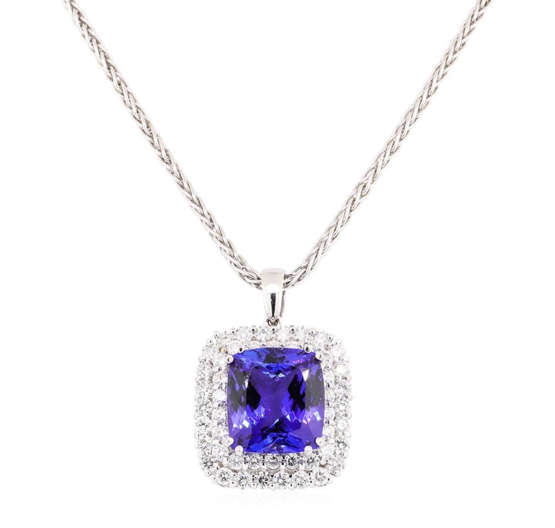 One electronically tested 14KT white gold lady's combination cast & assembled fashion pendant & chain 18.0' long, 2.3 mm square wheat link with a lobster claw clasp with a double cushion halo with a bright polish finish. The featured lady's necklace has a drop of 37 millimeters in length. Identified with markings of '14K'. Condition is new, good workmanship. Containing: One prong set square cushion modified brilliant cut natural tanzanite, measuring 17.20 x 15.55 x 22.65mm, (depth est.) 5%. bulge factor, approximate weight of 50.20ct., clarity is eye clean, medium dark, strong, violetish blue color, (GIA vB 6/5), cut is very good. Colored gemstones are presumed to have been subjected to commonly used enhancement processes. Transmitting light with no distortion, transparent. Graded in the setting. Twenty-Two prong set round brilliant cut diamonds, measuring 2.80 - 2.75 x 1.70mm (depth est.) approximate total weight of 22 Stones = 1.80ct. Graded in the setting. Color G - H Clarity VS-2 to SI-2 Cut Very Good Twenty-Six prong set round brilliant cut diamonds, measuring 3.00 - 2.90 x 1.80mm (depth est.) approximate total weight of 26 Stones = 2.50ct. Graded in the setting. Color H - I Clarity SI-1 to SI-2 Cut Very Good. Total Weight of Colored Stones 50.20ct.. Total Weight of Diamonds 4.30ct.. Total Weight of Pendant & Chain 30.00gm GAS Appraised at $59795.00. GAS Appraised.